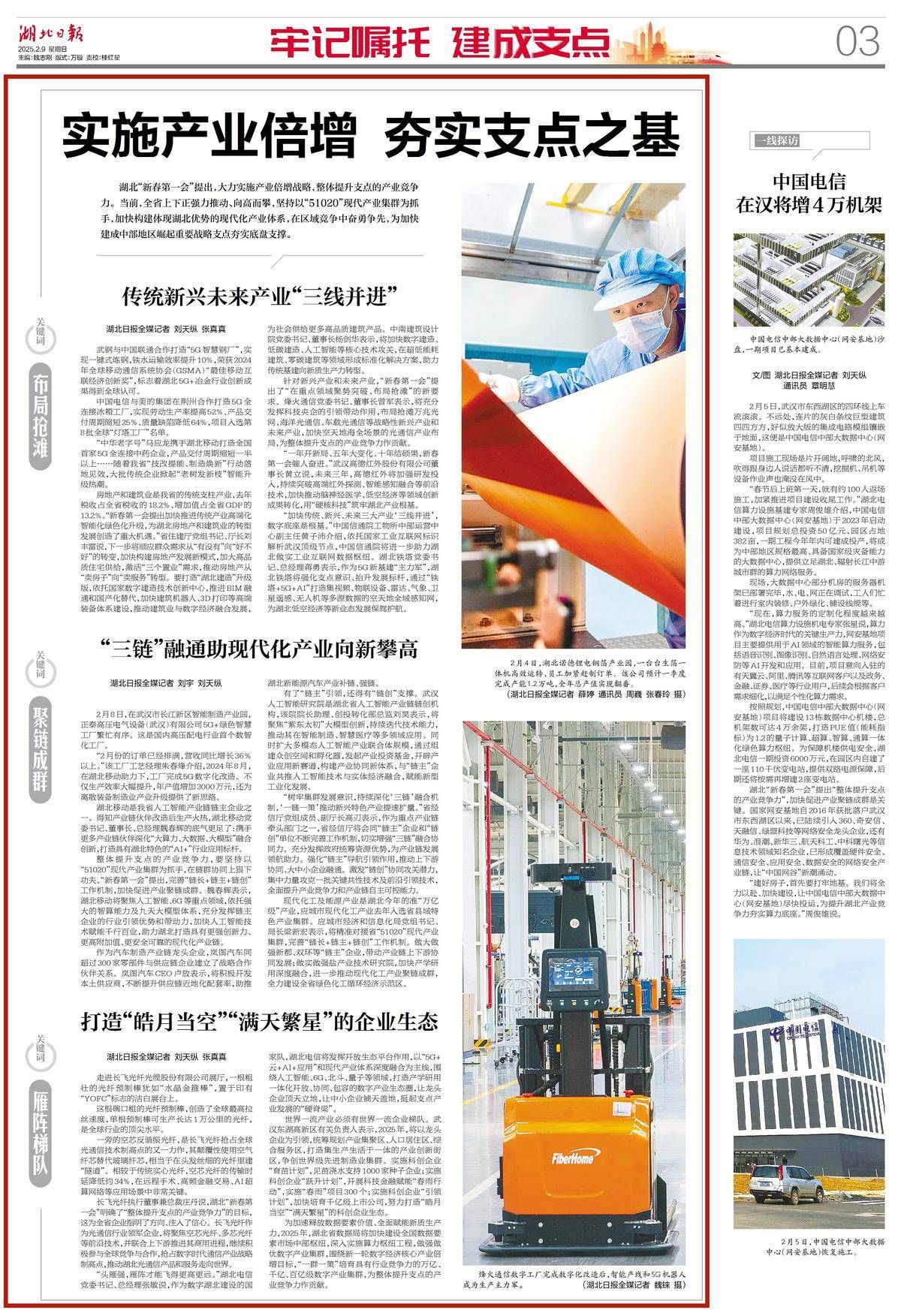 湖北“新春第一会”提出,大力实施产业倍增战略,整体提升支点的产业竞争力。当前,全省上下正强力推动、向高而攀,坚持以“51020”现代产业集群为抓手,加快构建体现湖北优势的现代化产业体系,在区域竞争中奋勇争先,为加快建成中部地区崛起重要战略支点夯实底盘支撑。