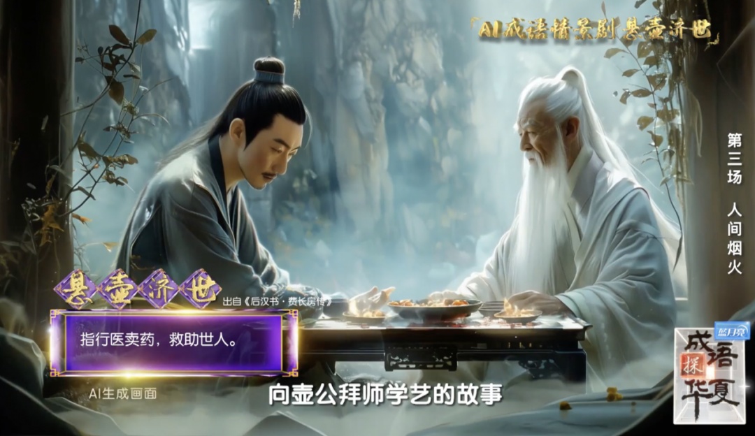 在随后“悬壶济世”、“董奉活燮”、“虎守杏林”的故事中更是利用AI生成全虚拟的情景剧,短短几分钟的情景剧,看到了孟母的拳拳爱子之心,也感受到了费长房与董奉的医者仁心。我们在节目中邂逅了一场虚拟与现实、冰冷与火热的相遇,这不仅仅是成语文化的盛宴,更是一次中国传统文化的温度与深度的深刻体验。