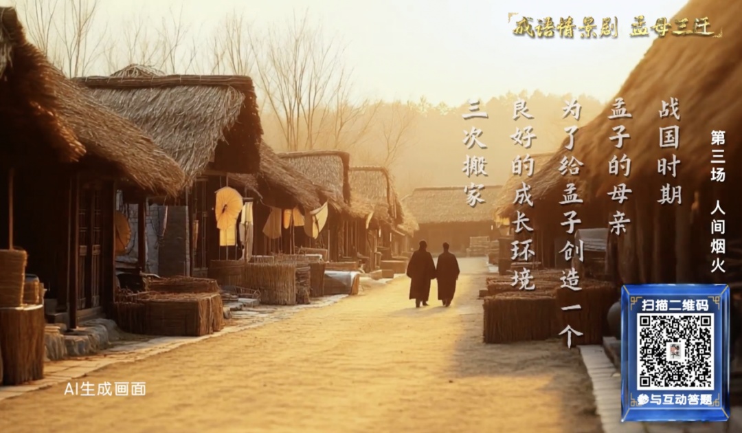 成语是对语言魅力的探索,是对文化根脉的追溯,更是一场跨越时空的精神旅程。《成语探华夏》积极拥抱新技术,在展现“孟母三迁”的故事中利用AI技术还原了独属于那个时代的村舍、房屋,配合利用真人扮演,将孟母三迁的故事娓娓道来,让耳熟能详的故事以全新的形式展现在观众面前。