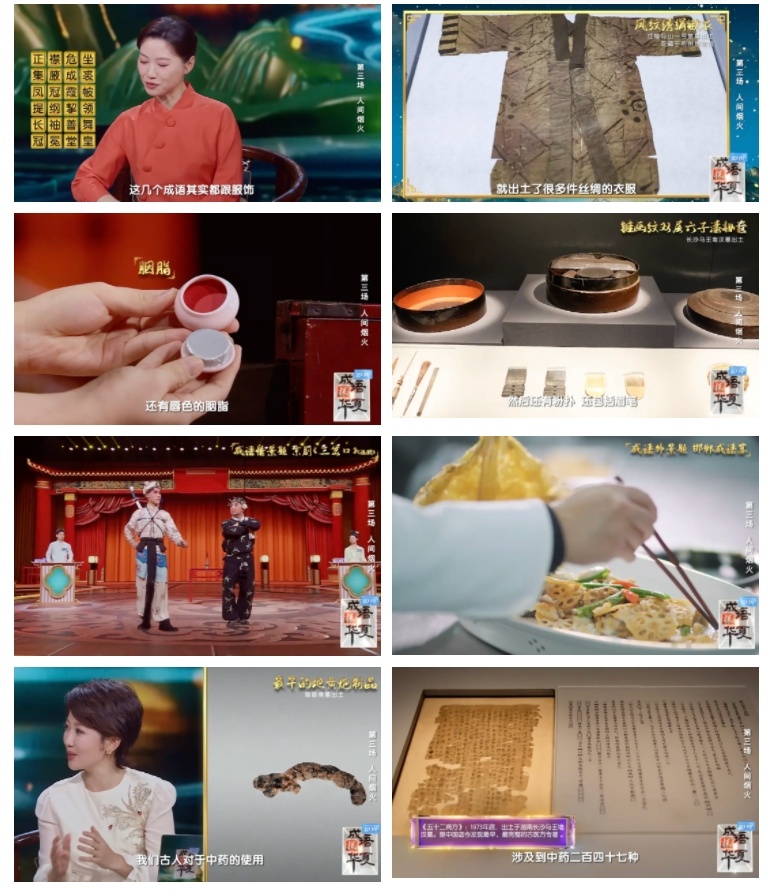 成语具有高度凝练性,这个特点注定了它是诞生于烟火中的文明。《成语探华夏》第三期节目提到的成语涵盖了“服饰”“彩妆”“饮食”“戏曲”“医药”等多个方面,而这些看似细碎的角落拼凑成了生活,也构成了成语世界的重要组成部分。