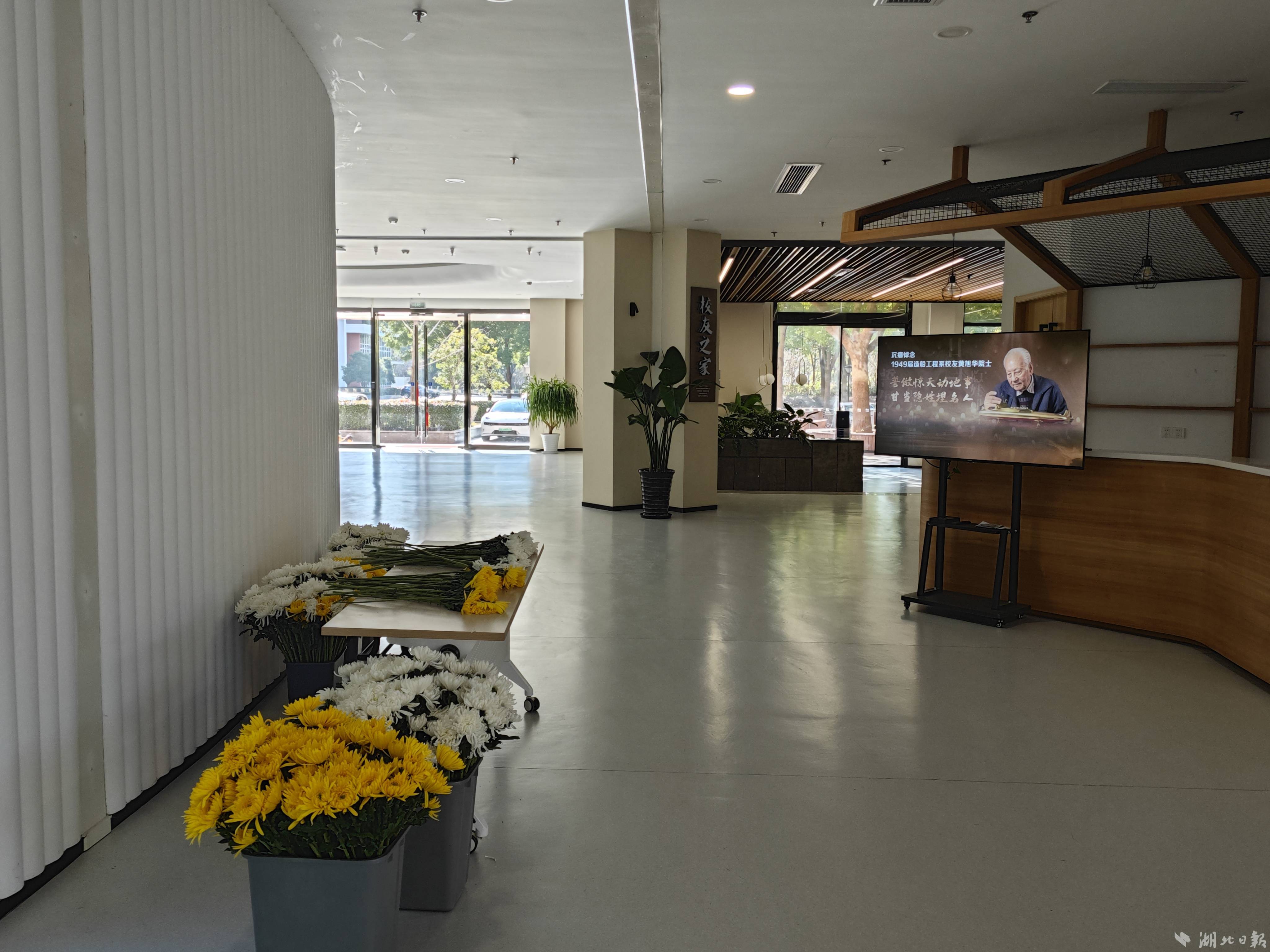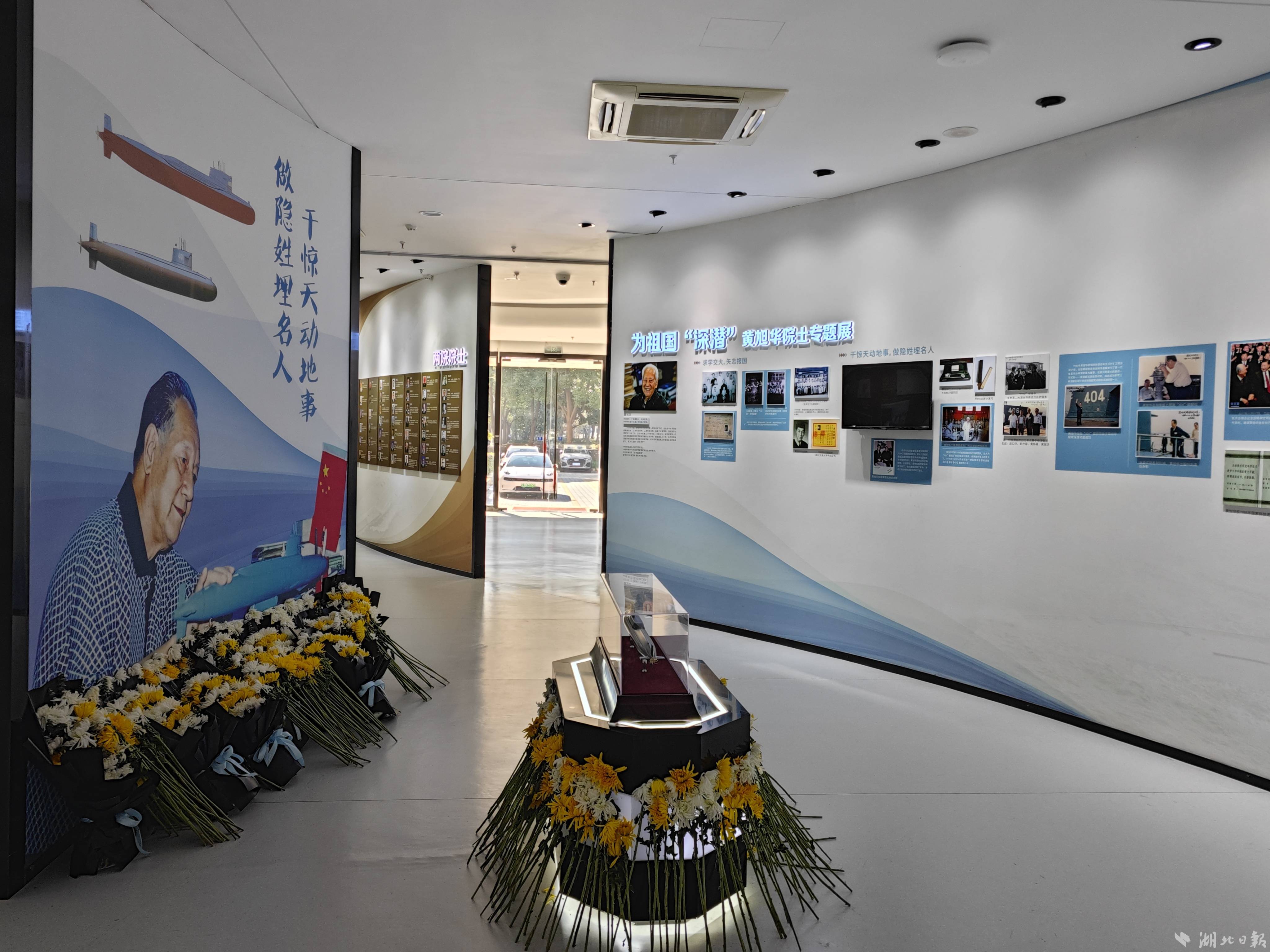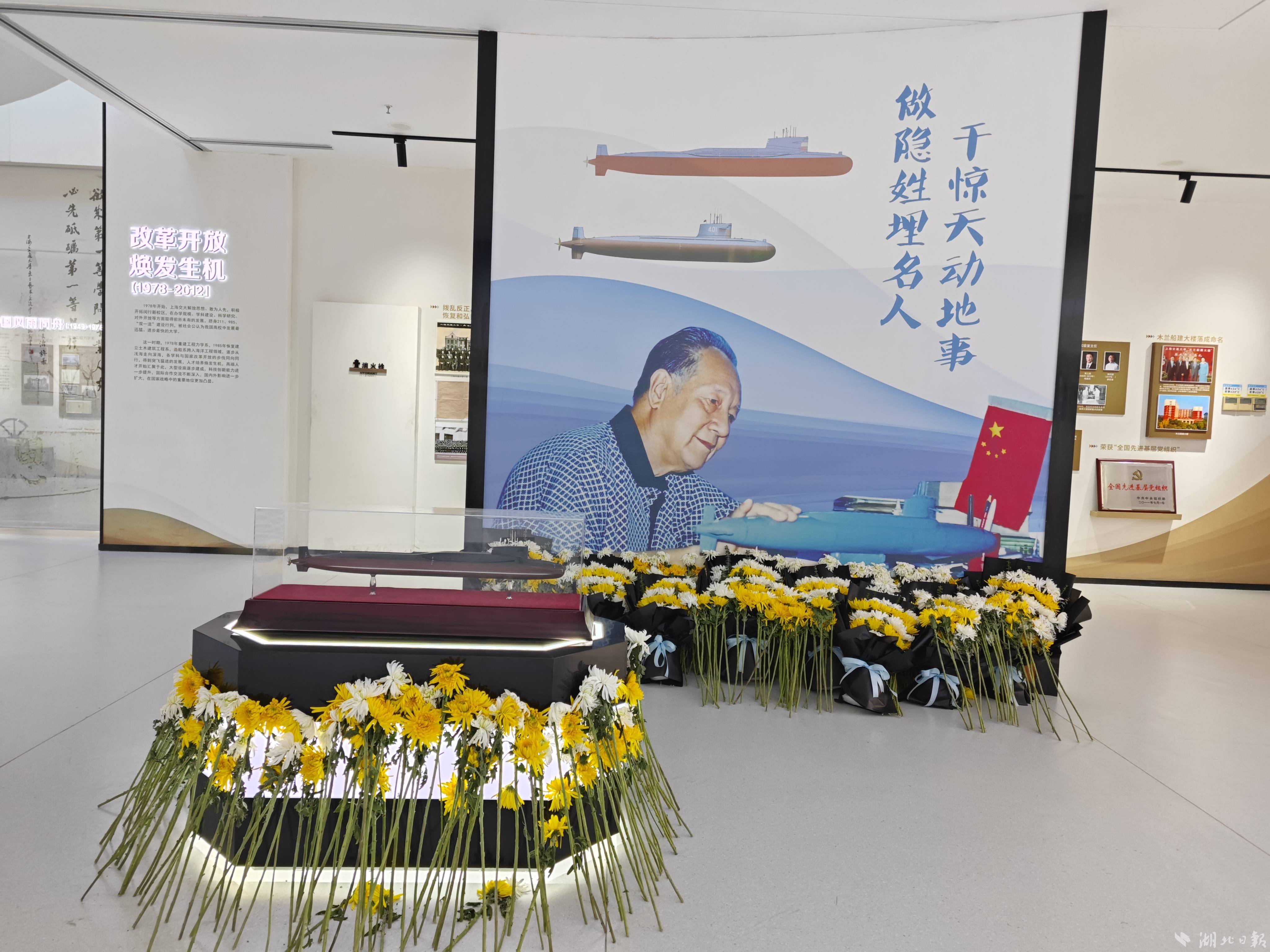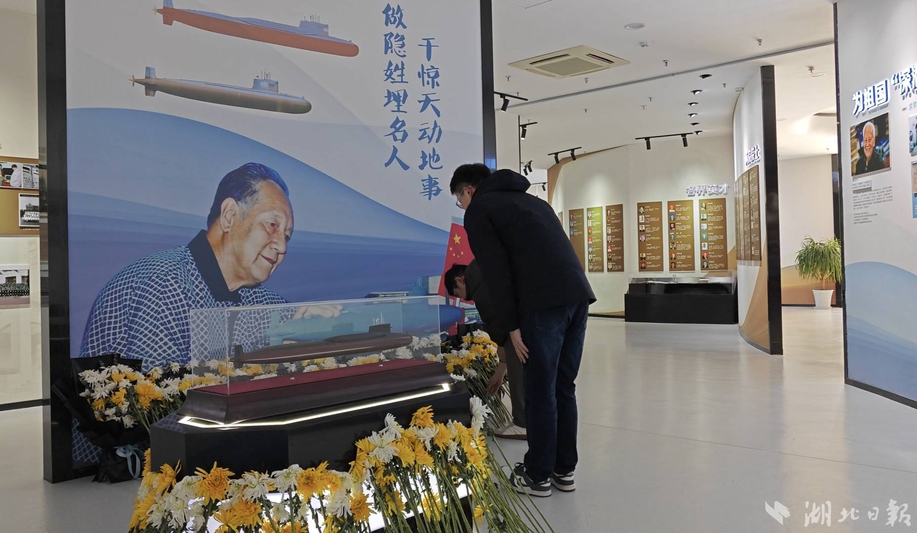 在船建大楼一楼大厅的“为祖国‘深潜’——黄旭华院士专题展”前,摆放着“长征一号”核潜艇模型,不时有学生前来献花缅怀。