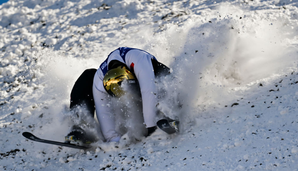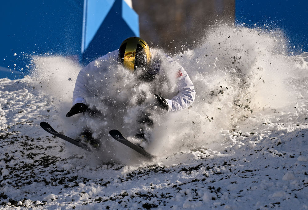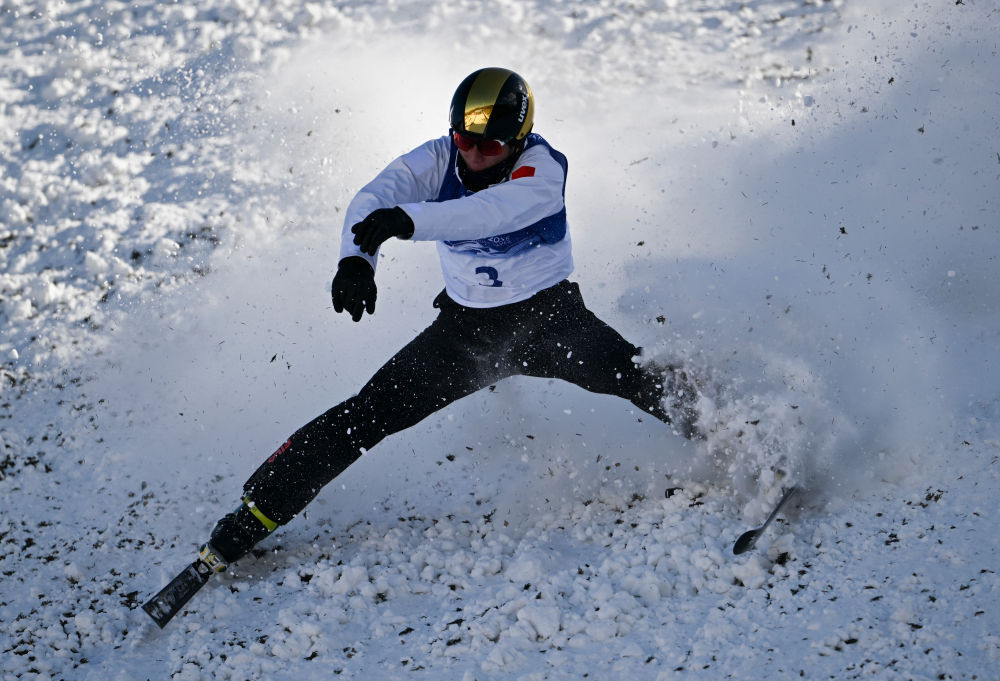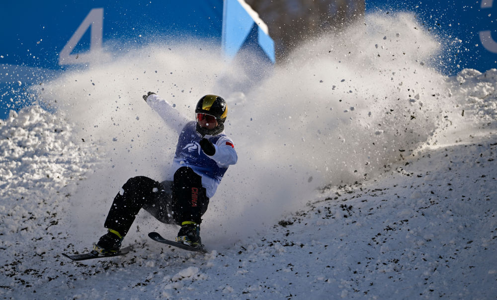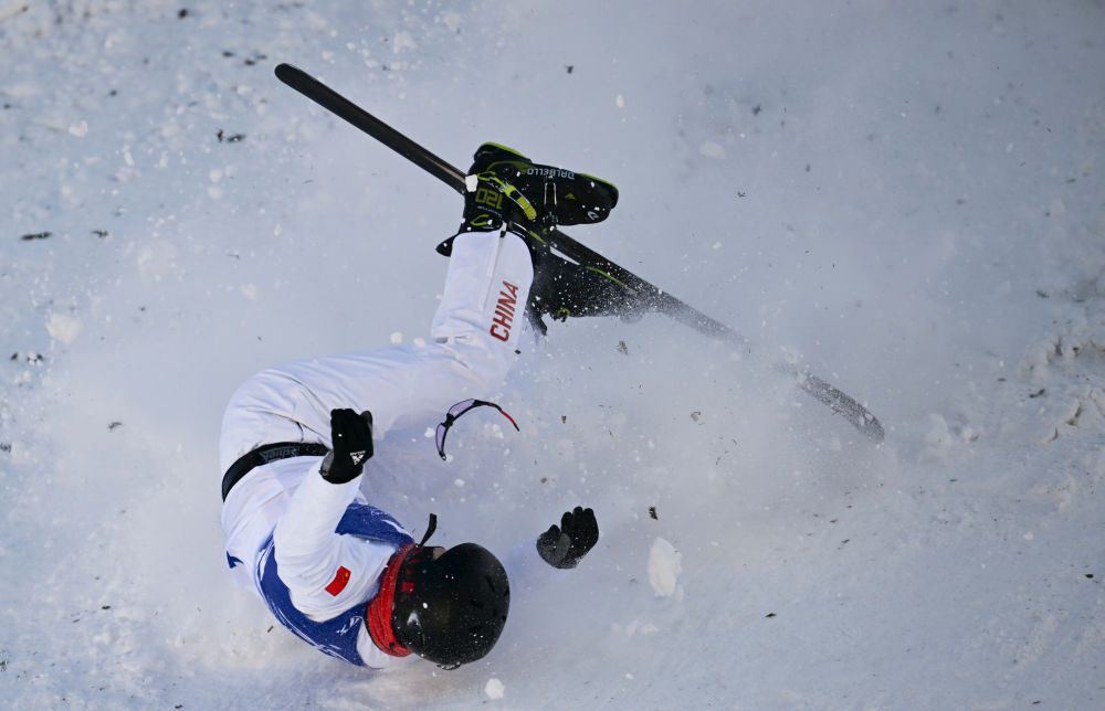 ↑中国选手李心鹏在落地时发生失误。新华社记者 夏一方 摄