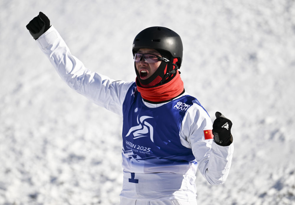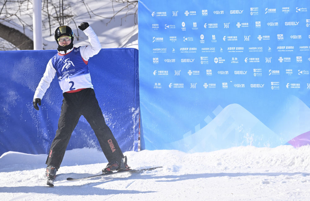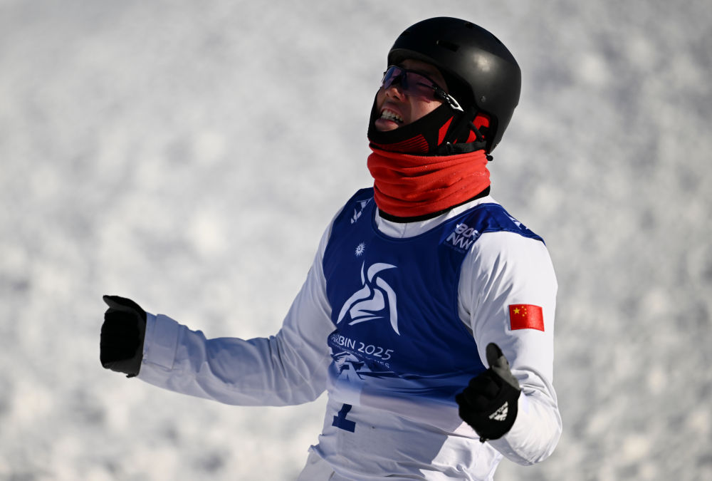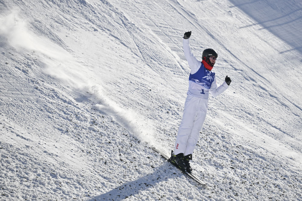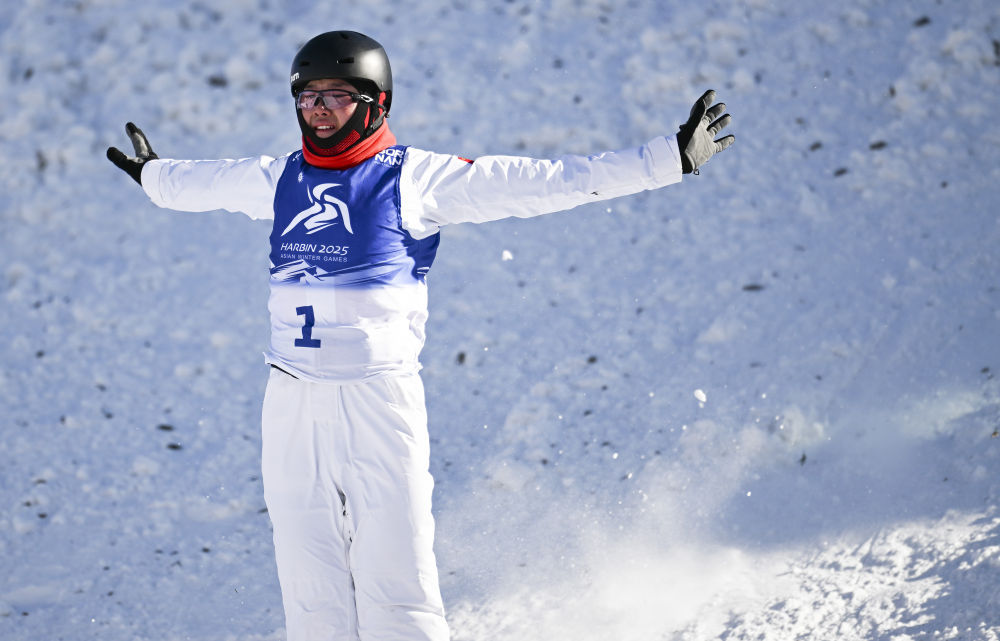 ↑中国选手李心鹏在落地后庆祝。新华社记者 夏一方 摄