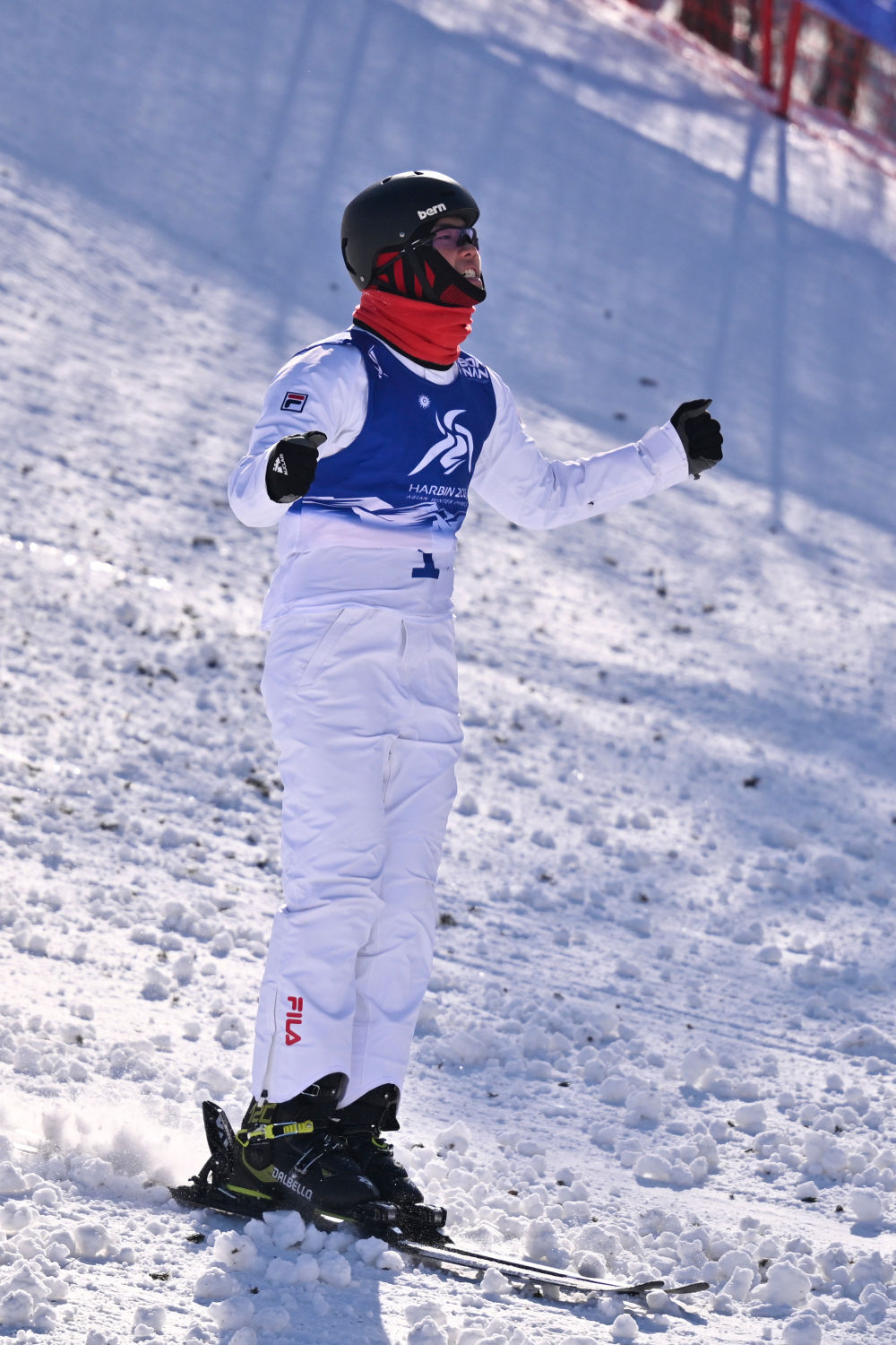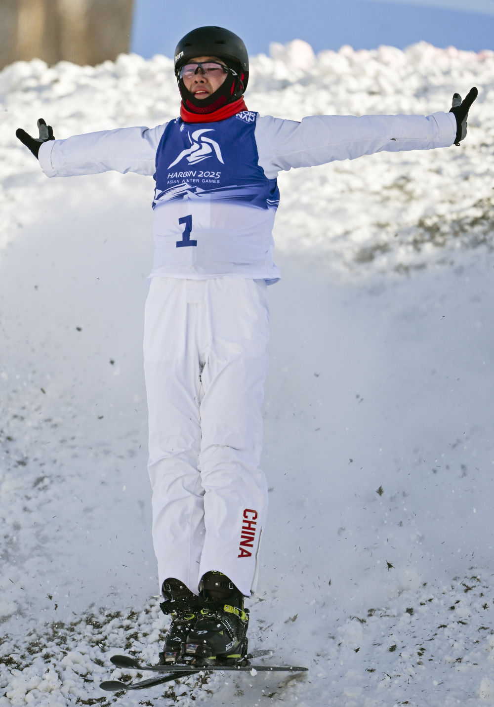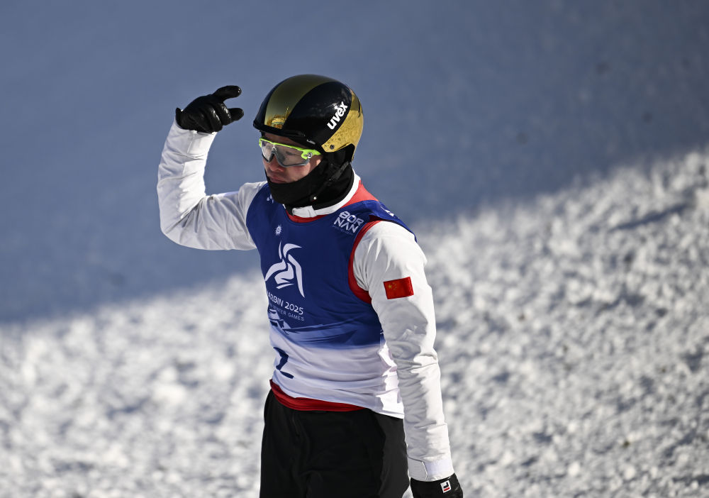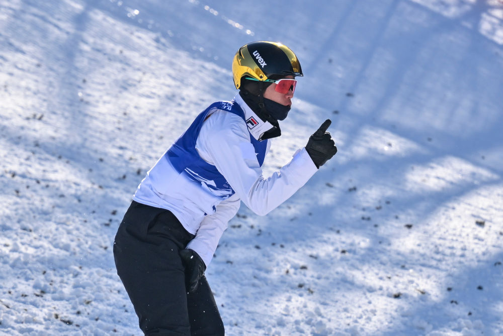 ↑中国选手李心鹏在落地后庆祝。新华社记者 夏一方 摄