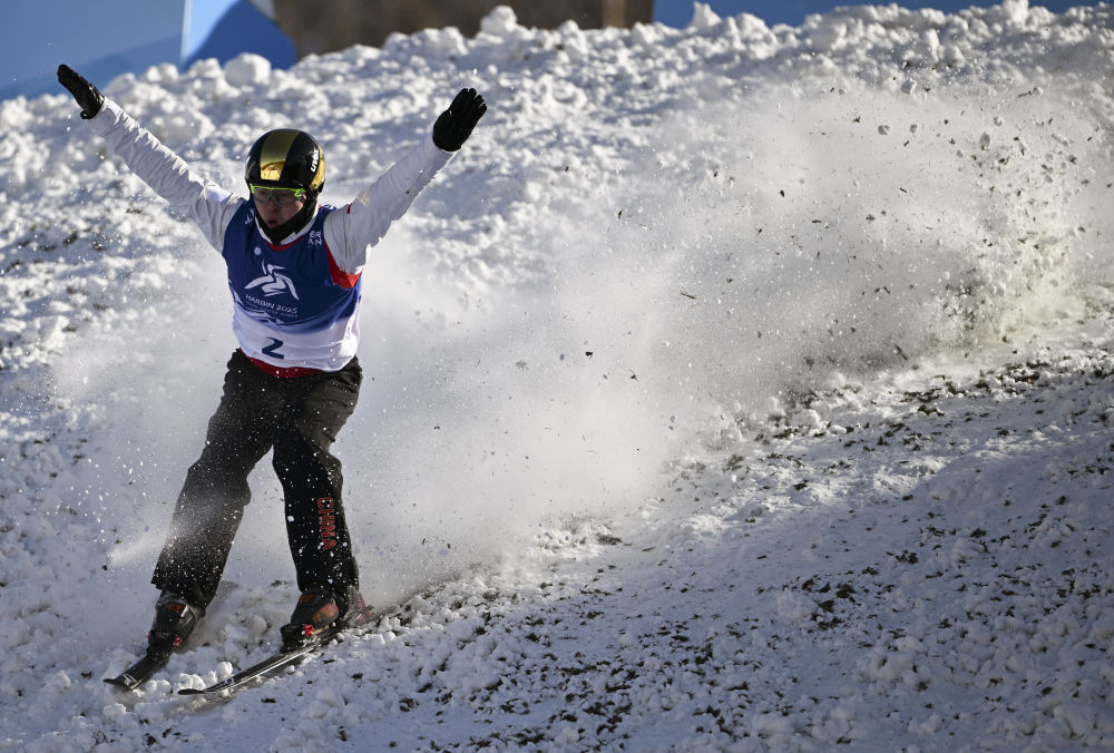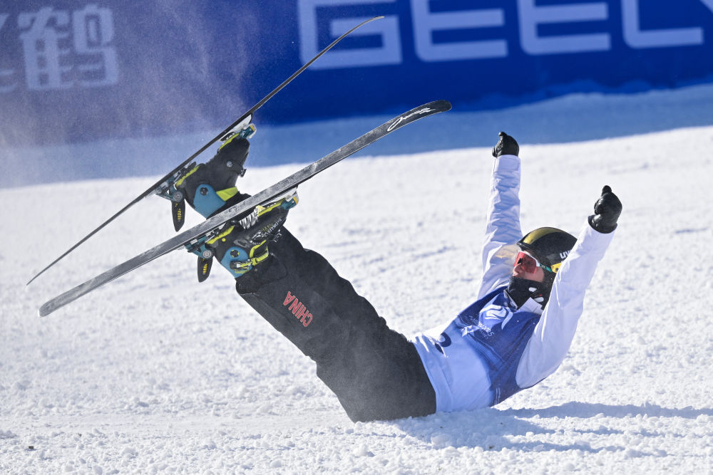 ↑中国选手杨龙啸在比赛中庆祝时摔倒。新华社记者 杨晨光 摄