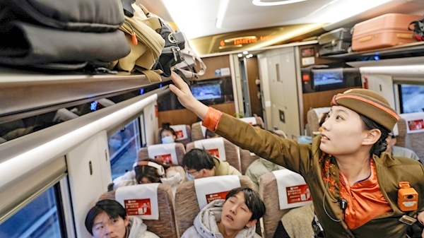 7点45分,列车到站,她们分别守候在车门口,协助旅客尽快上车。8点整,G3453次列车准时从汉口站出发。朱丽像往常一样,在车厢内巡视、调整行李架、为重点旅客提供服务。这是这个春节,她们在列车上的第三天值乘:除夕、大年初一后,初二再出发,将在大年初三完成这一期的工作班。