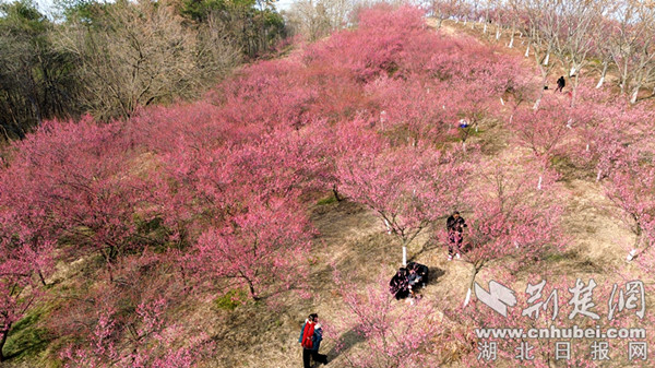 从空中俯瞰,粉色梅花如云霞浸染枝头,一片片竞相盛开犹如粉色毛毯,沿着山势铺满了山坡。前来赏梅的游客络绎不绝,簇簇花树下掩映着游客们赏梅、品梅的身影,阵阵微风吹落花雨,美不胜收。
