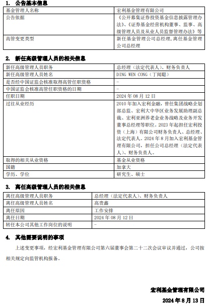 2022年12月,公司原董事长傅国庆因董事会改组离职,并由金旭接位,由此开启了高管队伍的更替。同月,高贵鑫履新总经理。2023年,刁羽、宋扬又先后任宏利基金副总经理。2024年8月12日,宏利基金公告高贵鑫因为工作安排卸任总经理和财务负责人,相关职务由宏利投资管理中国区董事总经理丁闻聪接任。