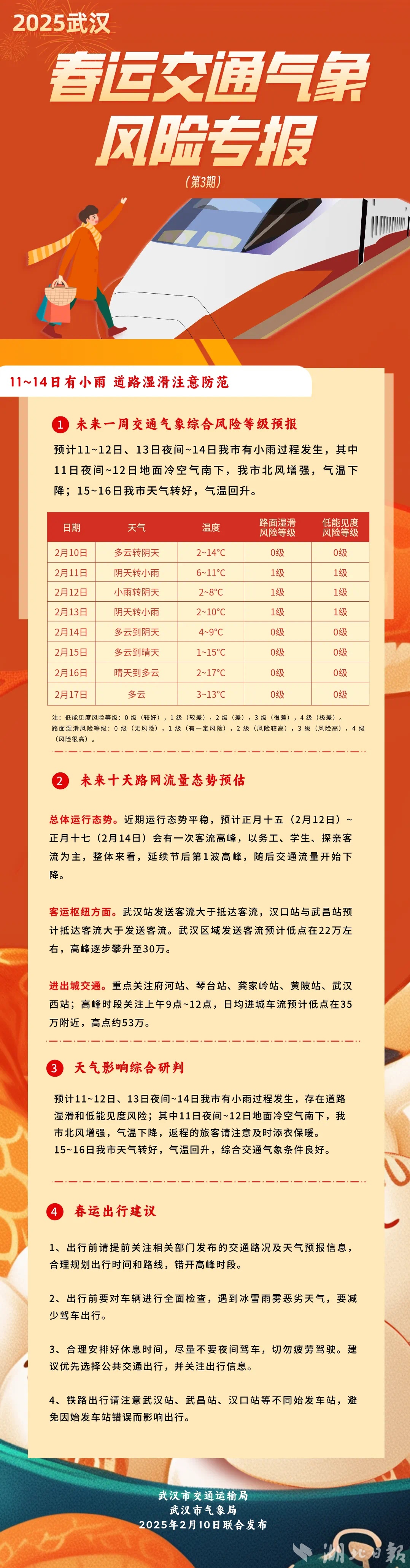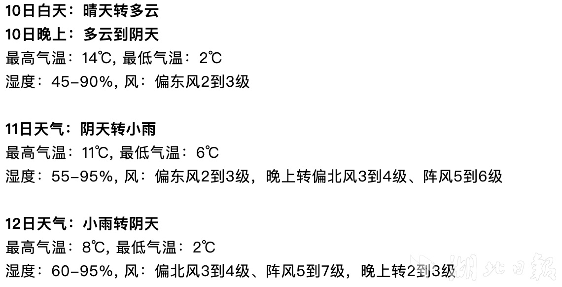 预计11-12日、13日夜间-14日武汉市有小雨过程发生,其中11日夜间-12日地面冷空气南下,武汉市北风增强,气温下降;15-16日武汉市天气转好,气温回升。