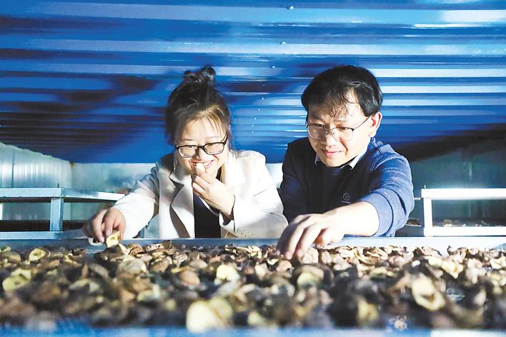 杨凤(右)和妻子向虹锦正在分拣香菇。 (湖北日报通讯员 焦国斌 摄)