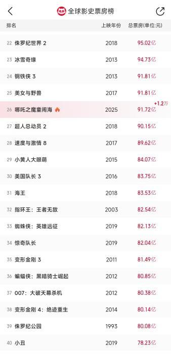 截至发稿前,《哪吒2》的累计票房(含预售)已达91.72亿,跻身全球影史票房榜第26名,成为前50名中唯一的华语电影。而随着群众观影热情的高涨,与影迷们自发的“二刷”“三刷”行为,这个数字还在不断攀升。