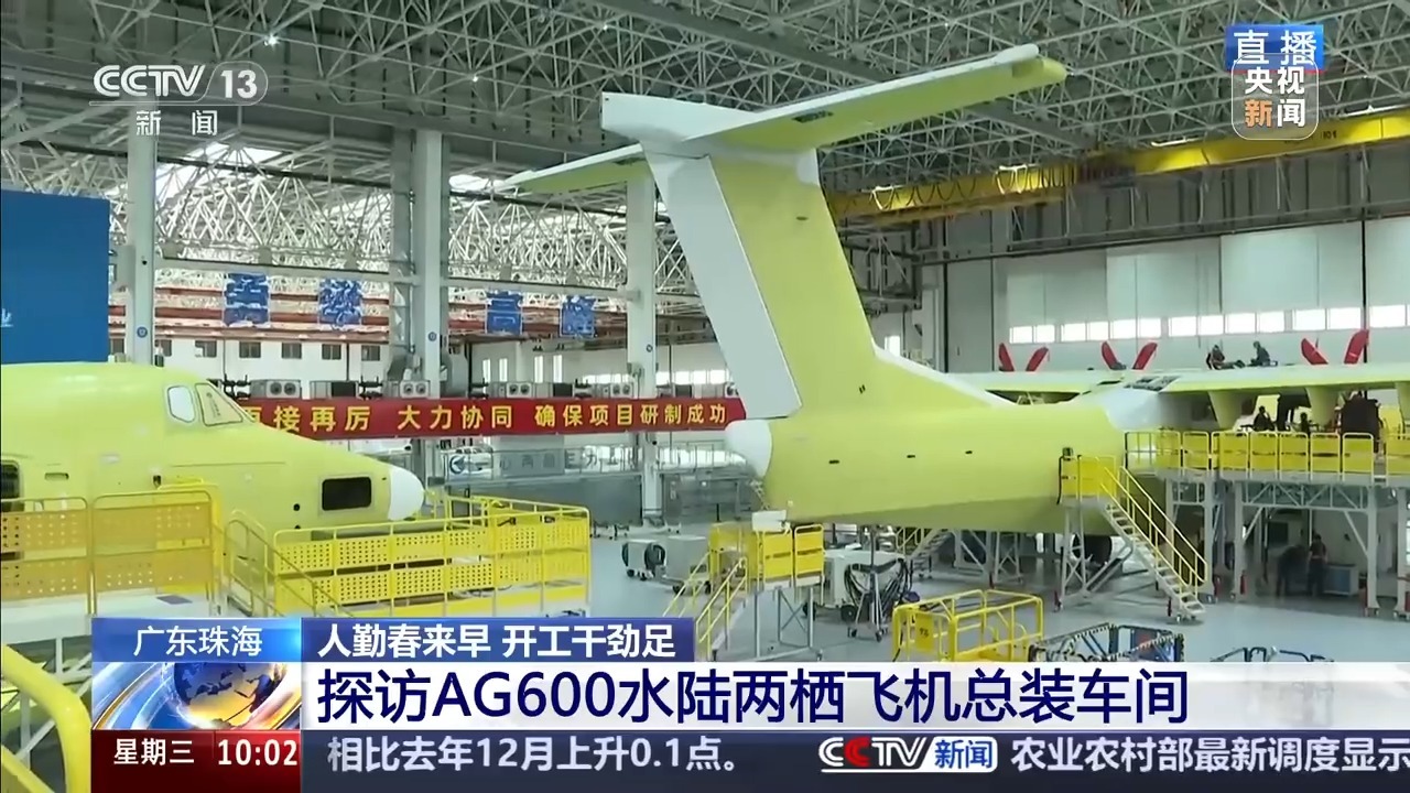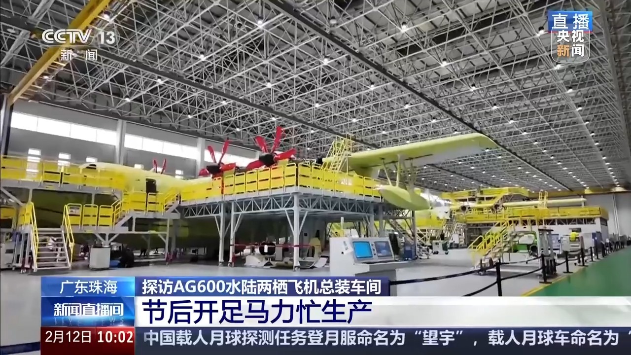 总台记者 赵菁:我现在是在珠海金湾区的AG600飞机总装车间,这里一共有3架AG600飞机正在进行组装、调试等工作。整个春节假期,这个车间都没有停工,现在这里每天有三百多名工作人员,在车间日夜赶工。现场工作人员告诉我们,这个车间把计划调度人员、工艺人员、班组管理人员集中在一起办公,保证有问题第一时间响应,部分工作区域施行24小时轮班制。