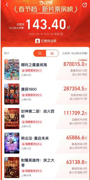 2月11日上午,据网络平台数据,电影《哪吒之魔童闹海》总票房(含点映及预售),已突破87亿元。
