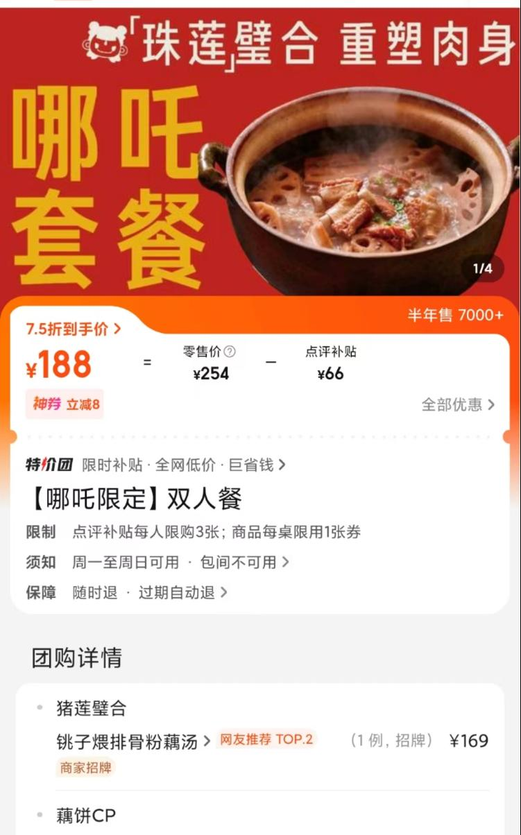 目前这款“哪吒限定双人套餐”的团购价为188元,套餐里含有排骨粉藕汤、脆皮藕夹和两份藕粉甜品,网友表示“商家也太会营销了”。