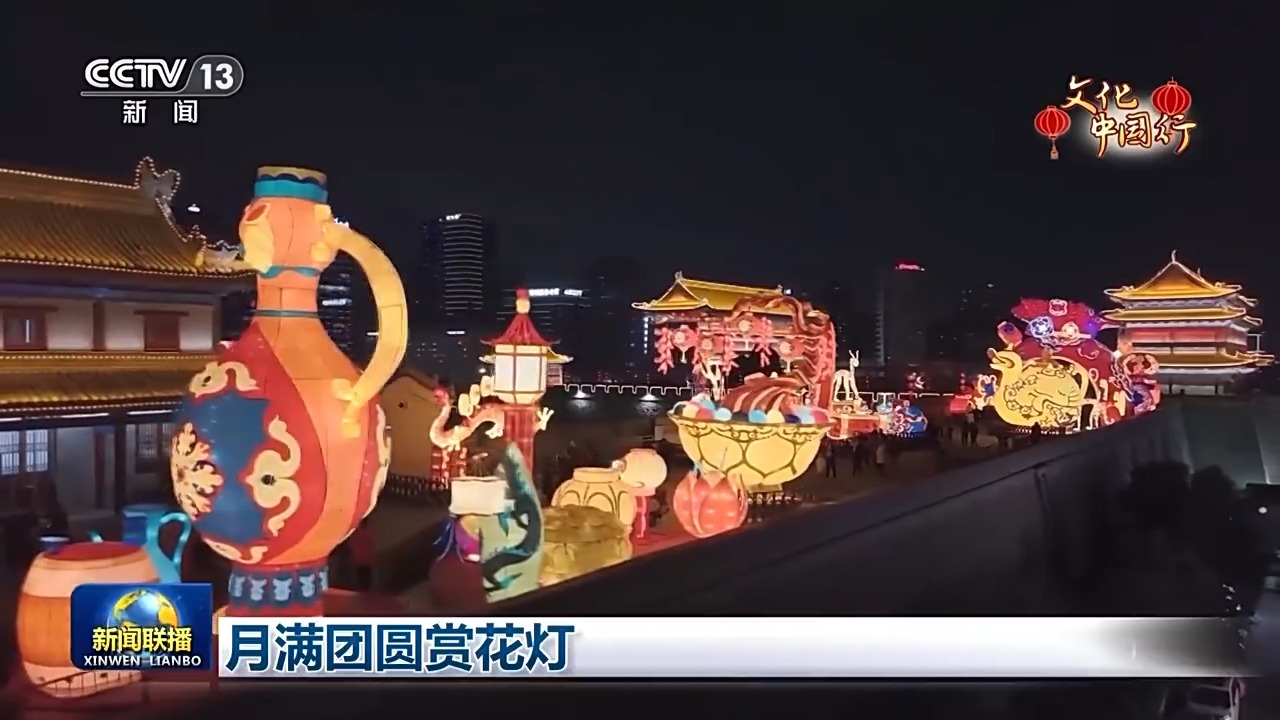 在古城西安,城墙灯会就沿袭了唐代以来“上元观灯”的习俗。一组灯彩以鸳鸯莲瓣纹金碗、三彩凤首壶等精美的唐代文物为原型,将唐诗、国宝文物等元素融入花灯设计。