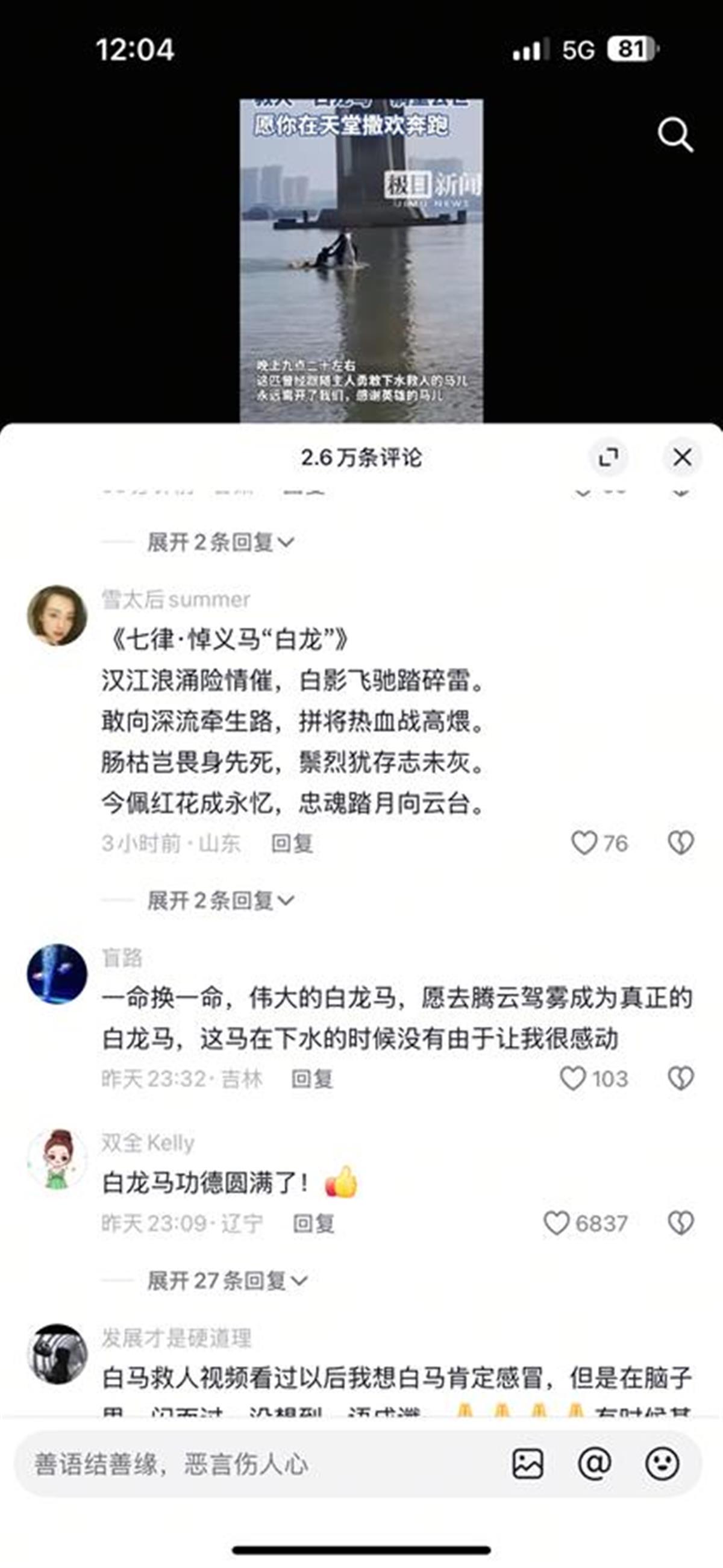 “白龙马”离世后,网友在评论区自发悼念,有网友表示,应该为白龙马在江边立一座雕像,让白龙马的义勇精神让更多人知道。