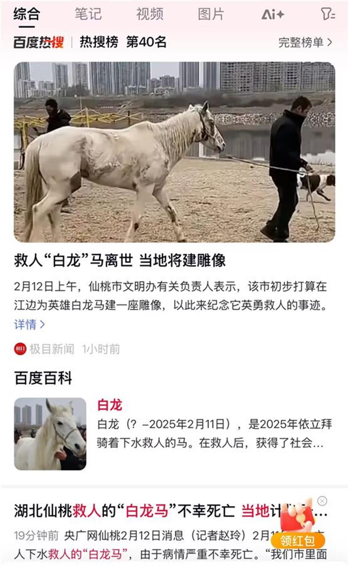 据词条显示:白龙(?-2025年2月11日),是2025年依立拜骑着下水救人的马。在救人后,获得了社会各界广泛的关注和关心。