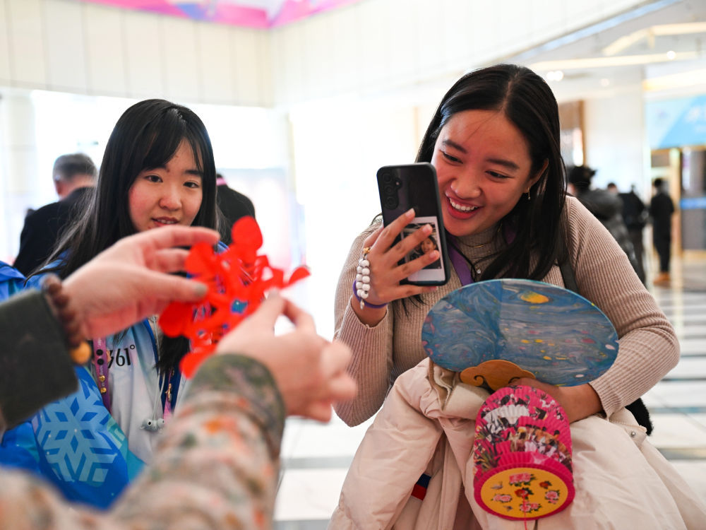 2月12日,菲律宾代表团的团部官员凯尔·威科拍摄非遗技艺“方正剪纸”。新华社记者 王曦 摄