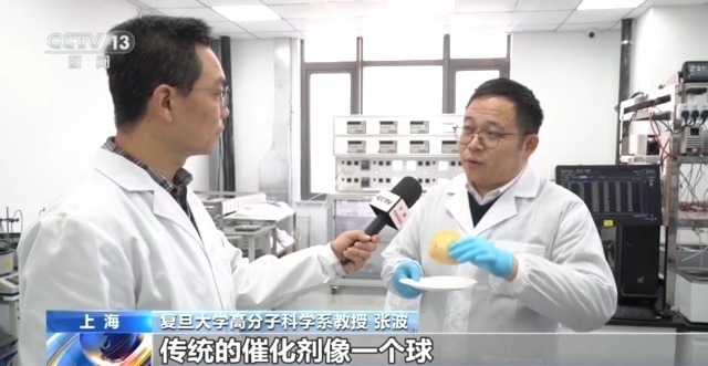 复旦大学高分子科学系教授 张波:传统的催化剂像一个球,而真正起作用的是它的表面,我们就想到了“麻球”。如果把表面的“芝麻”变成氧化铱,里面换成低成本的材料,“芝麻”是容易脱落的,把“芝麻”种在“麻球”上就不会脱落了。那这样我们就可以降低催化剂中氧化铱的用量,相同的催化剂我们原来的技术是1平方米设备用20克氧化铱,现在用这种新的技术它1平方米只需要用3克氧化铱。
