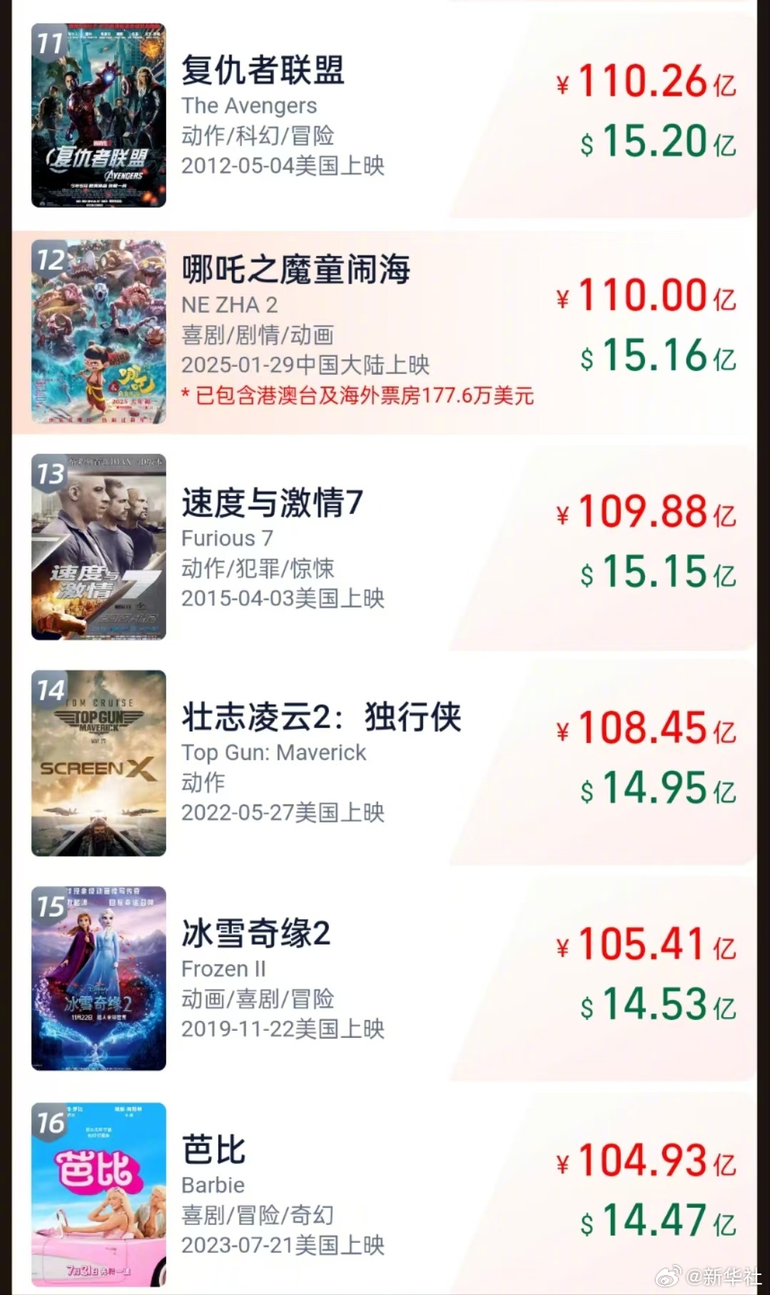 《哪吒2》票房已超110亿元 成功进入全球影史票房TOP12
