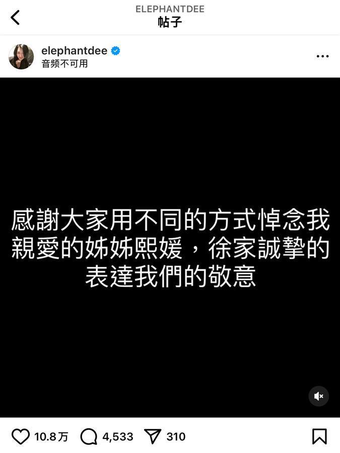 2月15日,小S在社交媒体上发文:“感谢大家用不同的方式悼念我亲爱的姐姐熙媛,徐家诚挚的表达我们的敬意。”配乐是《萧邦离别曲》。