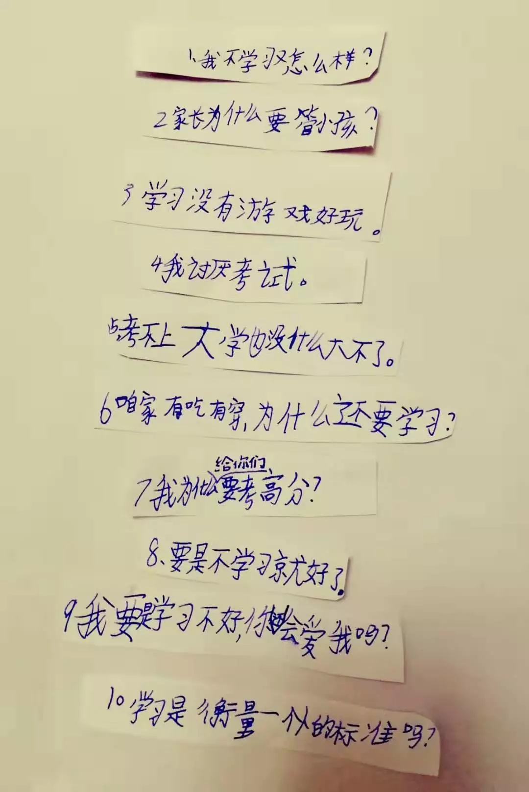 所以,我递给你一张纸,希望你写出10个不愿学习的理由,要发自肺腑,要真心实意。半个小时后,你完成了我给你布置的“作业”,递给我时,小眼睛里有着好奇,也有些疑虑。看着纸条上你认真写下的这10个问题 ,我想,这来自你内心的疑惑,也让很多孩子头疼不已。
