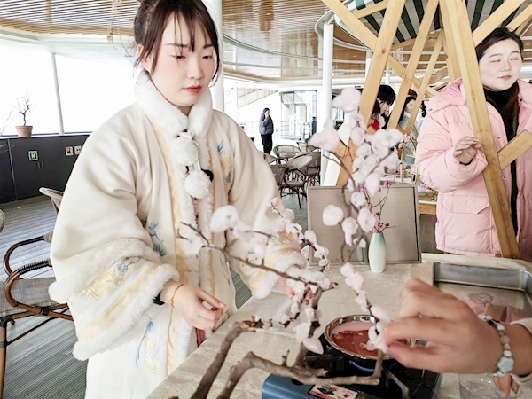 讲座结束后,极目新闻记者看到,市民纷纷上到游船三楼,参加游船上正在举行的“江水映梅”第一届水上梅花节。在这里,可以品尝梅花饮品,吃梅花点心,还可以体验“非遗手工蜡梅花”。“非遗手工蜡梅花”最受欢迎,市民们纷纷体验,直呼“太有创意,太神奇了!”。只见人们将手指用洗洁精水湿润后,沾上融化的蜡烛水,然后捏在梅花枝上,一朵朵粉红色的梅花,就栩栩如生地“开放”了。