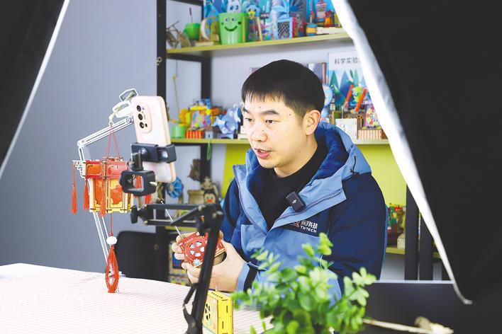 “这些都是我们为元宵节准备的‘旋转音乐宫灯’益智玩具,是一款可充电的旋转灯笼,温暖的灯光,配上祝福新年的音乐,十分喜庆。”余为伟介绍,这是探梦科技自主研发的一款玩具,灵感源于元宵节观花灯的民间习俗,“一上市就成为爆款”。