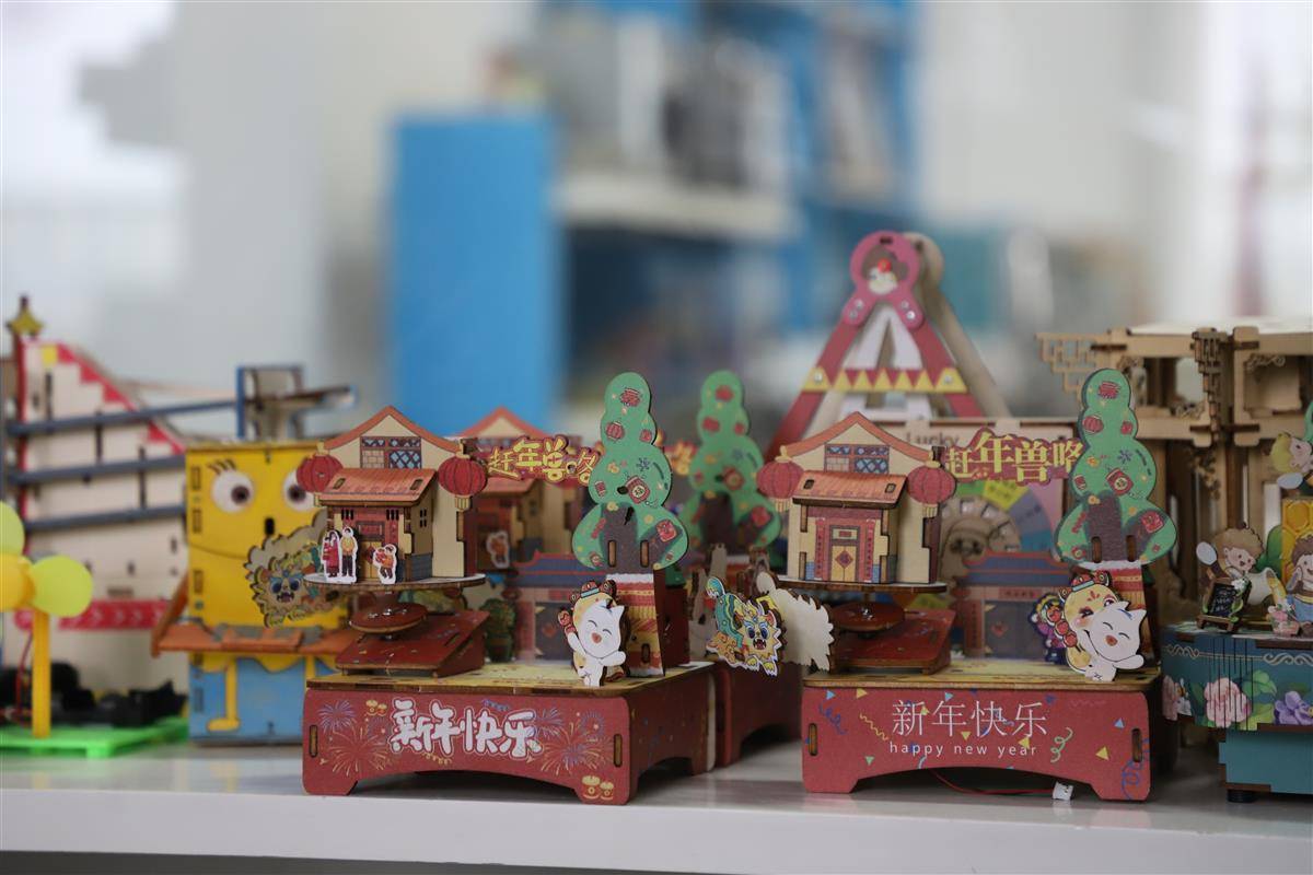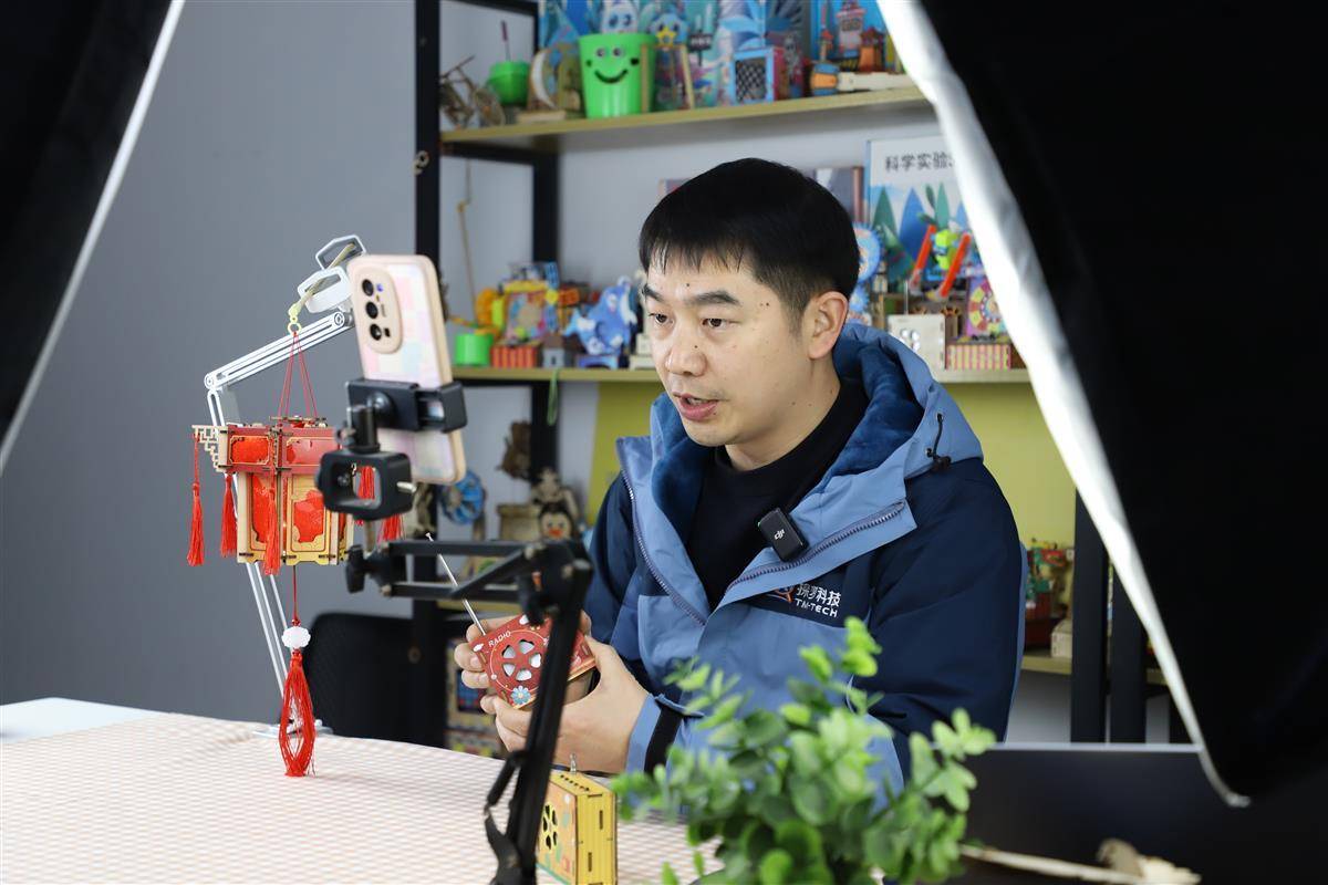 “这些都是我们为元宵节准备的‘旋转音乐宫灯’益智玩具,是一款可充电的旋转灯笼,暖暖的灯光,配上祝福新年的音乐,十分喜庆。”余为伟介绍,这是探梦科技自主研发的一款玩具,灵感源于元宵节观花灯的民间习俗,“一上市就成为爆款”。