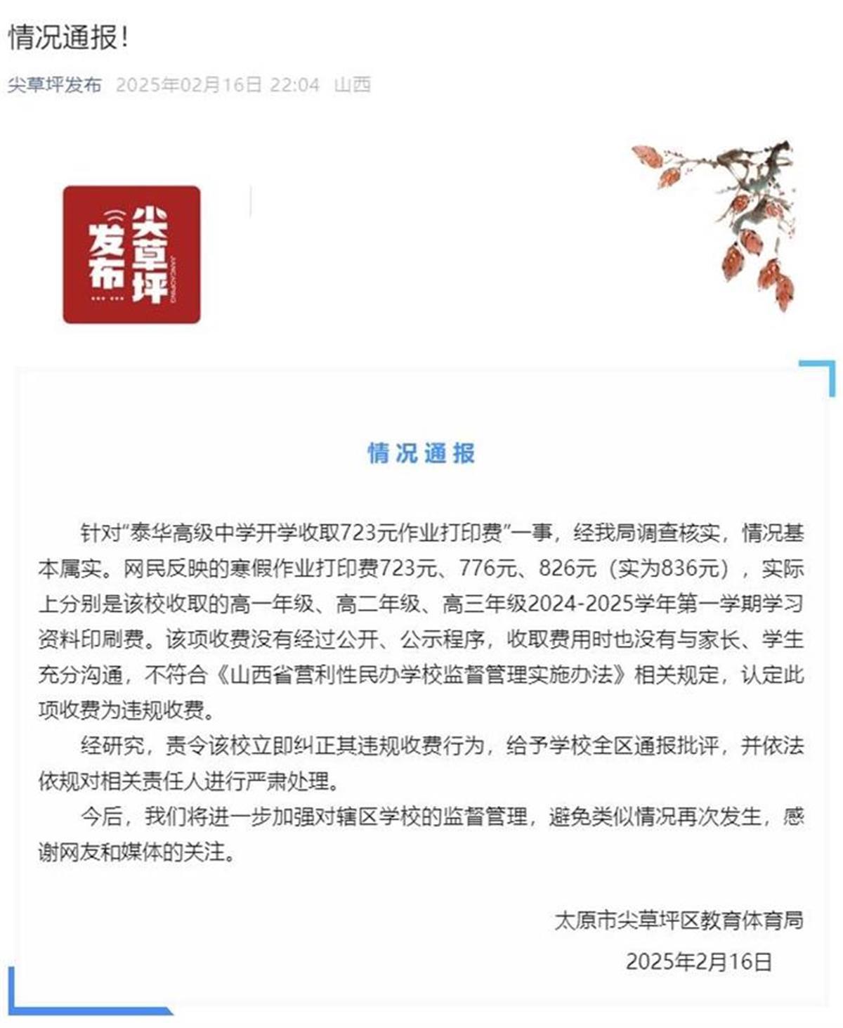 2025年2月16日晚,太原市尖草坪区教育体育局通报称,经该局调查核实,情况基本属实。寒假作业打印费723元、776元、826元(实为836元),实际上分别是该校收取的高一年级、高二年级、高三年级2024-2025学年第一学期学习资料印刷费。该项收费没有经过公开、公示程序,收取费用时也没有与家长、学生充分沟通,不符合《山西省营利性民办学校监督管理实施办法》相关规定,认定此项收费为违规收费。经研究,责令该校立即纠正其违规收费行为,给予学校全区通报批评,并依法依规对相关责任人进行严肃处理。(据2月17日北京日报)