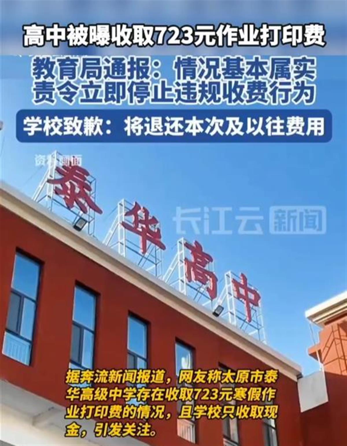 近期,一名山西网友发布的视频显示:“太原市泰华高级中学,寒假作业要学生交723块钱。”该网友称,这些打印纸张质量很差。也有网友称,723元是对每名高一学生所收取的打印费用,高二、高三学生每人分别收取了776元、826元,且学校只收取现金。