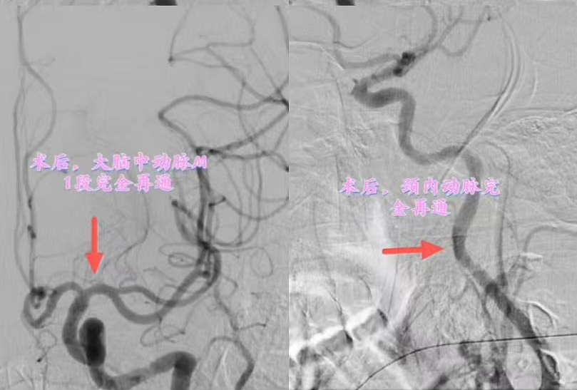手术过程中,团队克服了患者因失语导致的躁动,采用局麻联合镇静技术。术中发现患者左侧颈内动脉起始处及大脑中动脉M1段串联闭塞,经过近两小时的努力,成功取出大量血栓,闭塞血管完全再通。