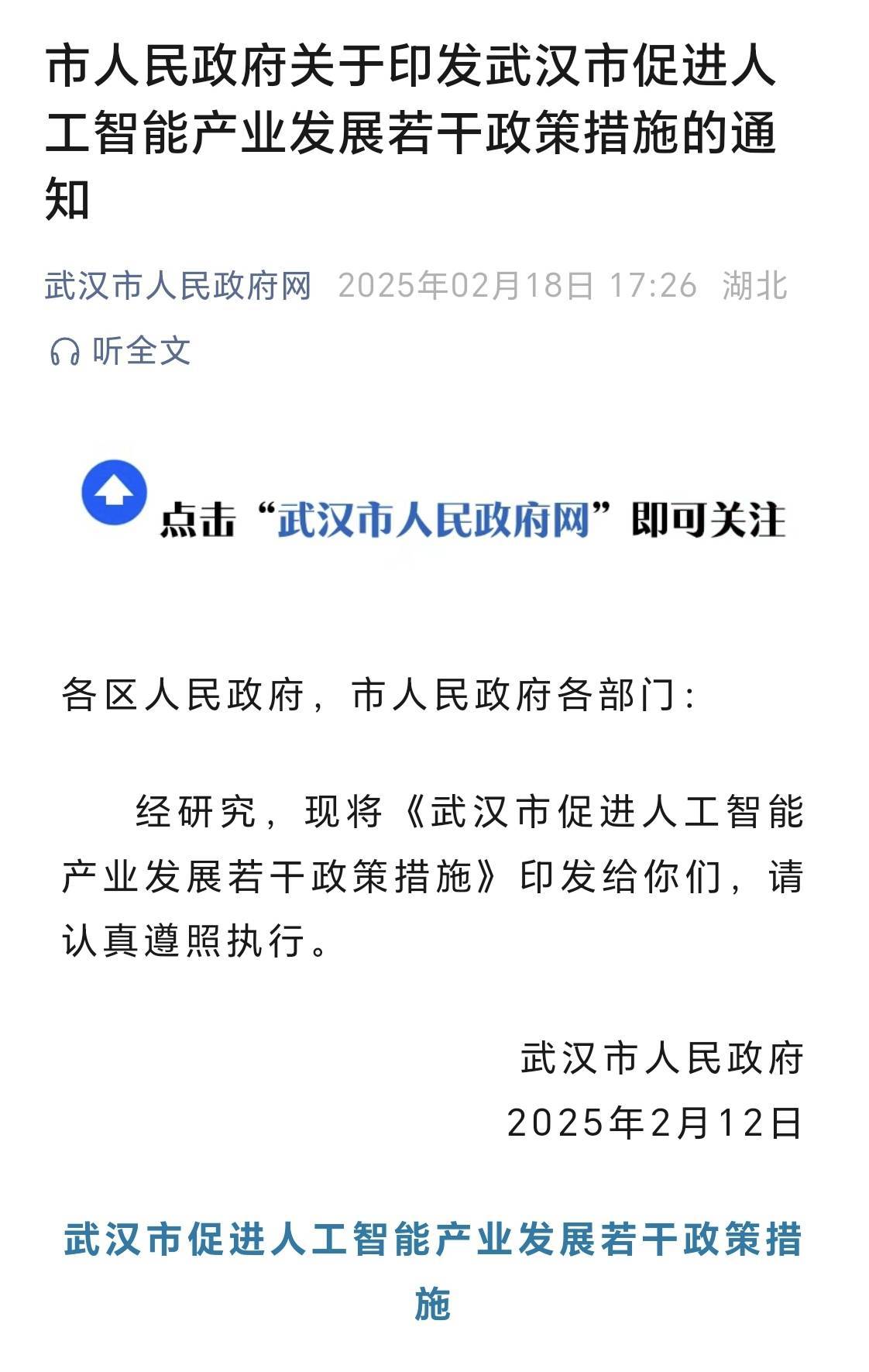 经研究,现将《武汉市促进人工智能产业发展若干政策措施》印发给你们,请认真遵照执行。