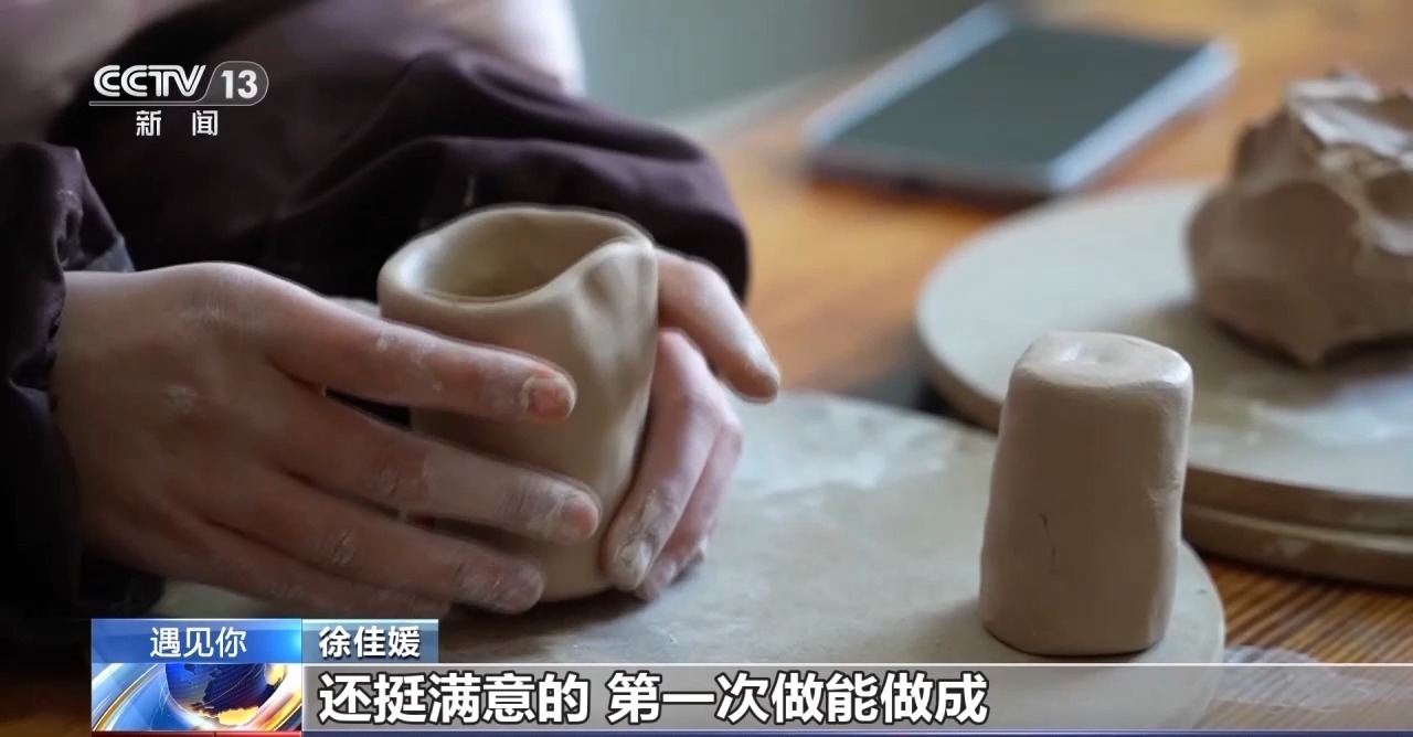 从配泥到揉泥,然后小心翼翼地将杯子塑形,徐佳媛专注地聆听着匠人师傅的讲解,体验陶艺杯子的制作。