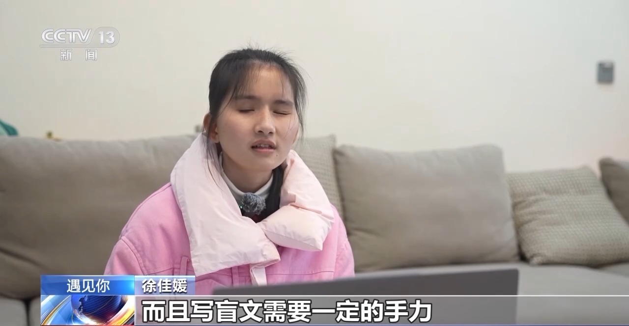 徐佳媛:我个子比较小,老是觉得没力气,而且写盲文需要一定的手力,我就会尝试用下巴压着写,这样我的写字速度就没有同龄人快,后面我就多练多练,然后手就有力气了。