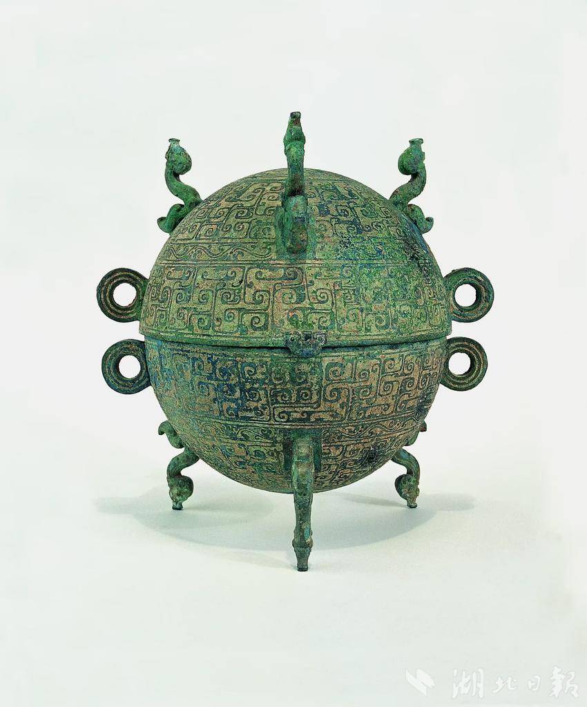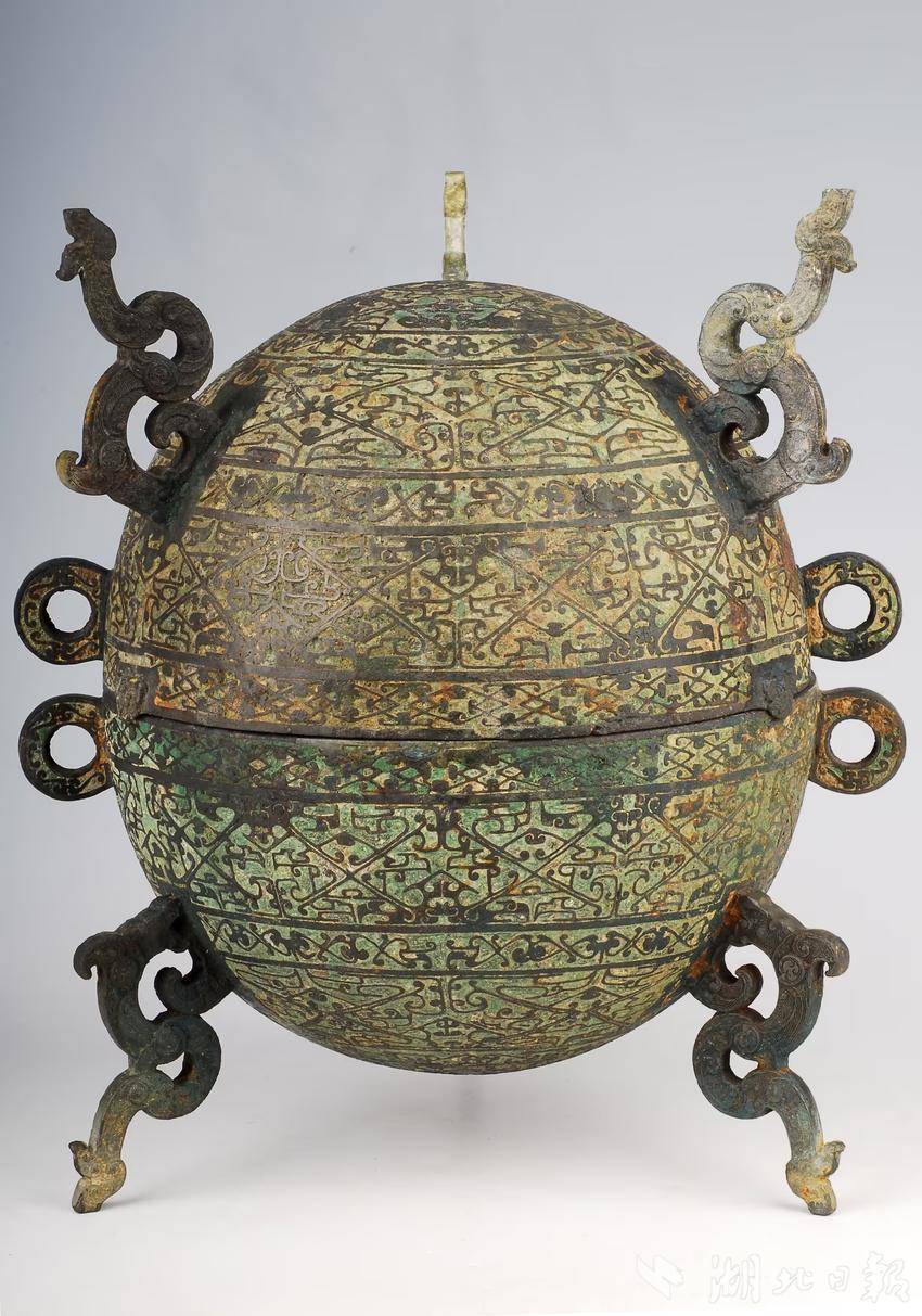 大鼎整体呈现出的浑圆造型,和古代名叫“敦”的青铜器如出一辙。敦曾是供古代贵族享用的盛食器,用于盛放五谷。湖北省博物馆收藏的嵌地几何云纹铜敦、随州市博物馆收藏的菱形勾连云纹敦,都是其中的精品。