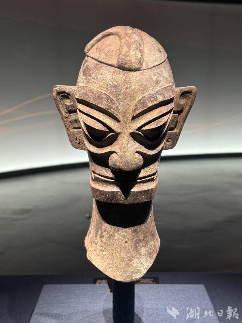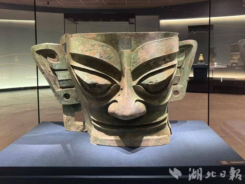 眼下正在盘龙城遗址博物院热展的“商翼四极——商王朝地方文明特展”,多件重量级三星堆文物仍在展出,包括青铜大面具、笄发青铜人头像等。其中,青铜大面具是目前已知三星堆遗址出土的体量最大、保存状况完好的大型青铜面具。