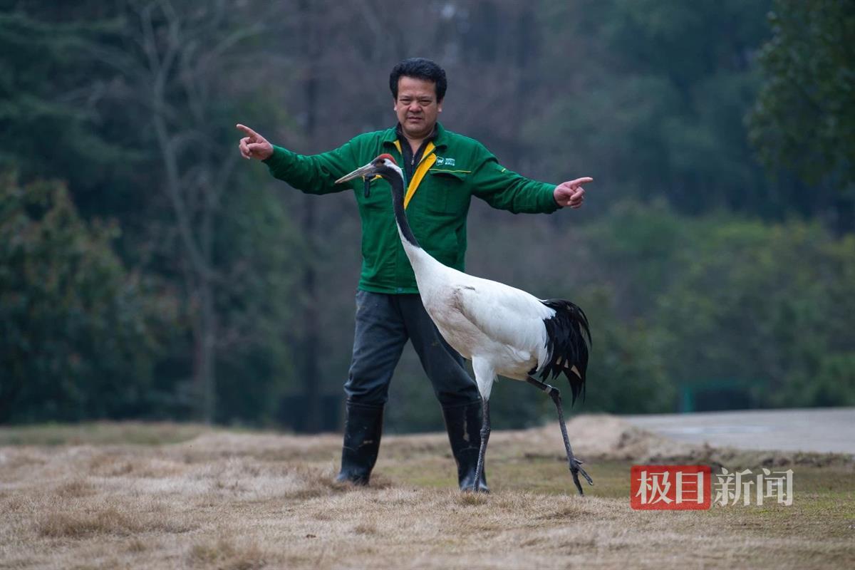 熊家炳训练丹顶鹤 (武汉动物园供图)