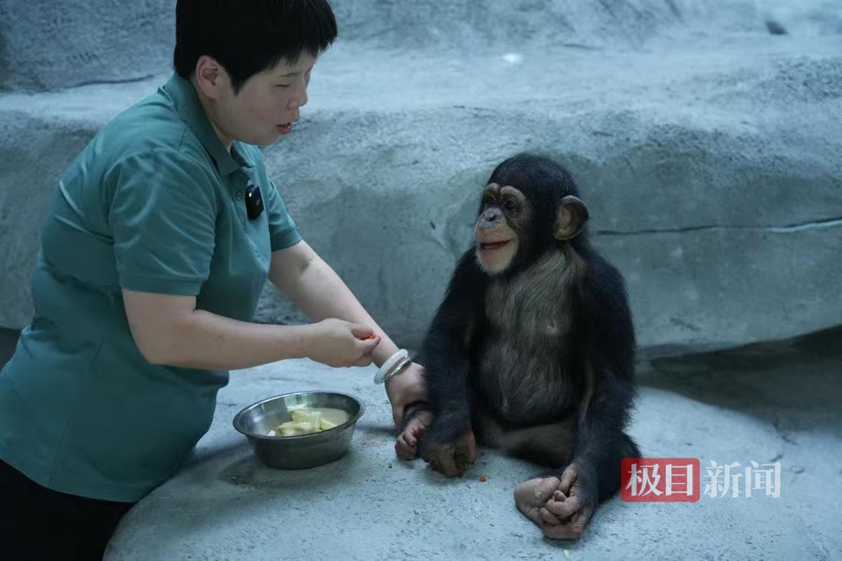 温柔的王利红给黑猩猩喂食、交流 (武汉动物园供图)