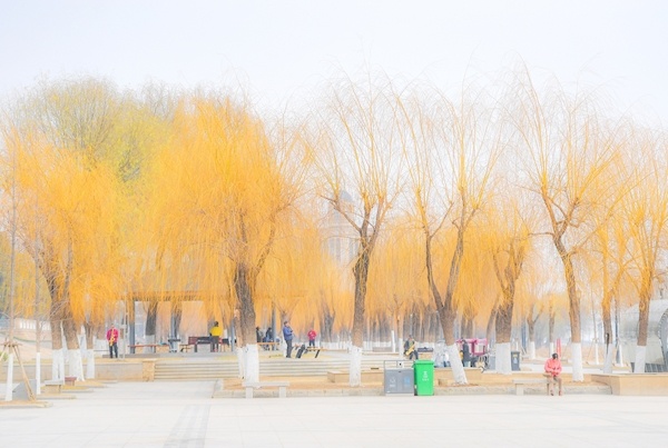 2月19日,天气晴朗,阳光洒落,汉口江滩成片的垂柳与薄雾交织,宛如给江滩披上金纱,散步的市民仿佛行走在画卷中。