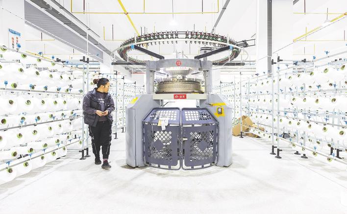 2月17日,湖北三圆纺织生产线,大圆机编织出高品质化纤面料。