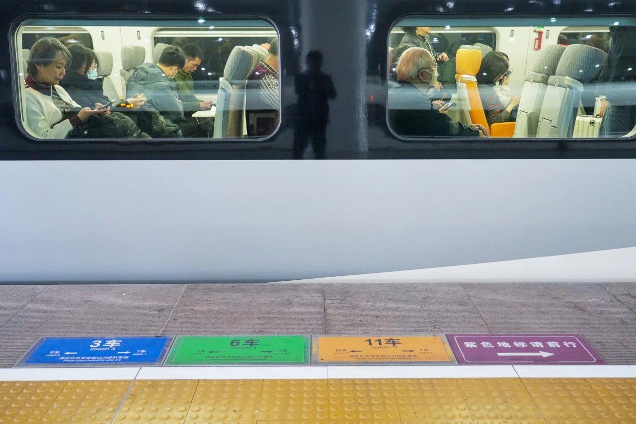 站台的电子显示屏上,会显示旅客乘坐列车车次对应的地标颜色。旅客按照地标的颜色,以及地标色块上标注的车厢数字,就能快速找到自己的车厢。