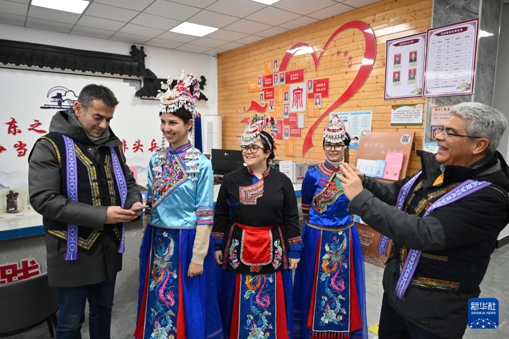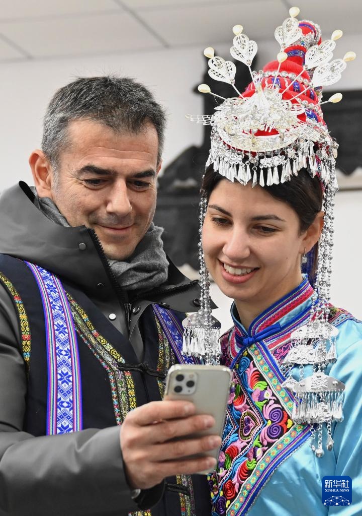2月20日,霞浦县溪南镇半月里村旅游服务中心内,意大利客人穿着畲族服饰自拍。