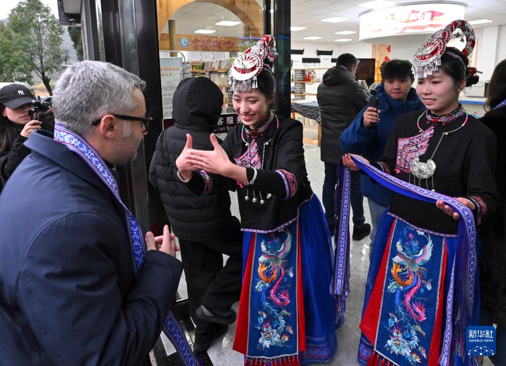 2月20日,在霞浦县溪南镇半月里村,身着畲族服饰的女孩欢迎意大利客人。