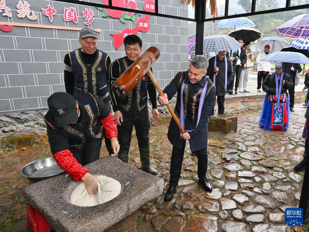2月20日,意大利客人在霞浦县溪南镇半月里村体验打糍粑。