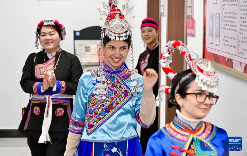 2月20日,在霞浦县溪南镇半月里村旅游服务中心内,两位身着畲族服饰的意大利女士(前)走出更衣室。