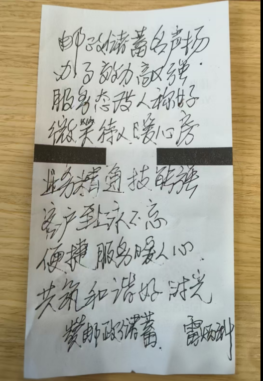 业务办理完毕后,老人从衣兜里掏出一张折叠整齐的纸条,拿过笔,在纸条上用工整字迹写下一首点赞诗:《赞邮储银行》。服务态度人称好,微笑待人暖心房......便捷服务暖人心,共筑和谐好时光。落款处“雷炳科”三个字力透纸背。
