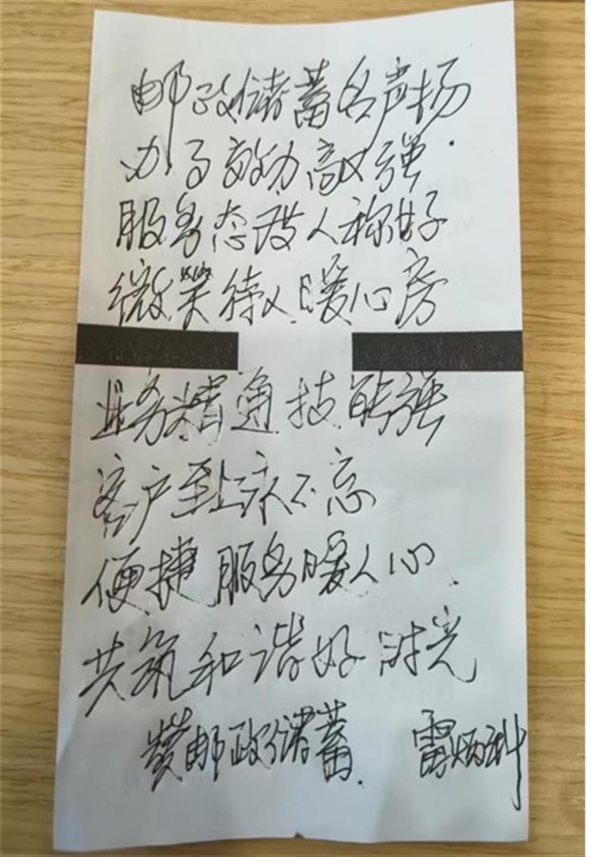 更令工作人员感动的是,业务办理完毕后,老人从衣兜里掏出一张折叠整齐的纸条——上面用工整字迹写就《赞邮储银行》:“服务态度人称好,微笑待人暖心房……便捷服务暖人心,共筑和谐好时光。”落款处“雷炳科”三个字力透纸背。