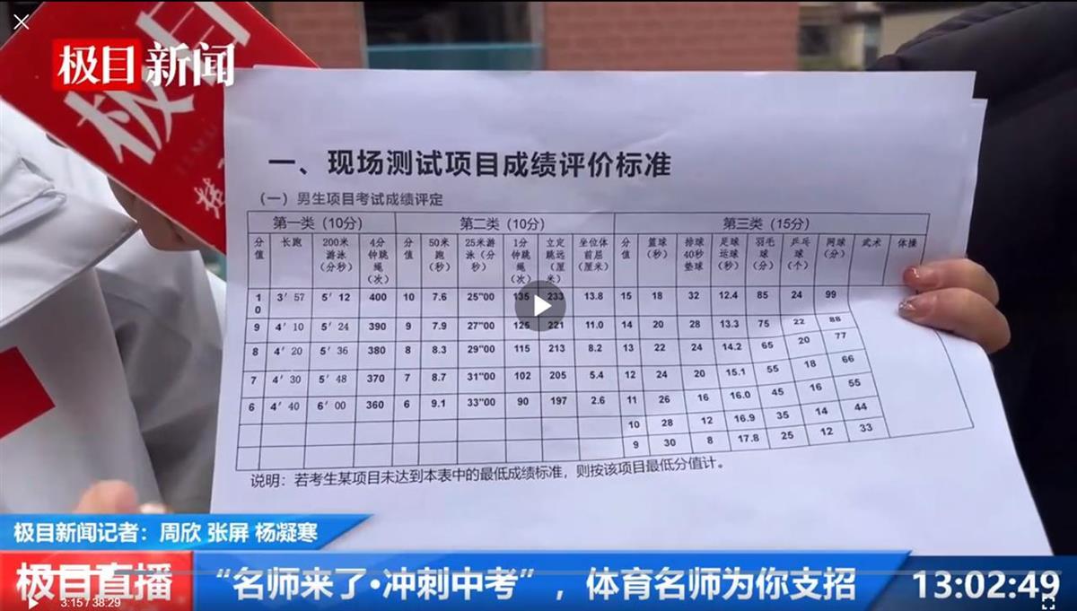 直播一开始,覃业娥介绍,目前,武汉中考体育科目现场测试项目有三大类:第一类体能,考生从男生1000米/女生800米、200米游泳(不限泳姿)和4分钟跳绳等中“三选一”;第二类基本素质,考生从50米跑、坐位体前屈、立定跳远、25米游泳、1分钟跳绳等中“五选一”;第三类技能,考生从篮球、足球、排球、羽毛球、乒乓球、网球、体操、武术等“八选一”。
