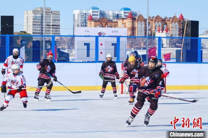2月22日,中俄界江黑龙江国际冰球友谊赛在冰封的黑龙江江面上举行,图为儿童组比赛现场。 王琳 摄